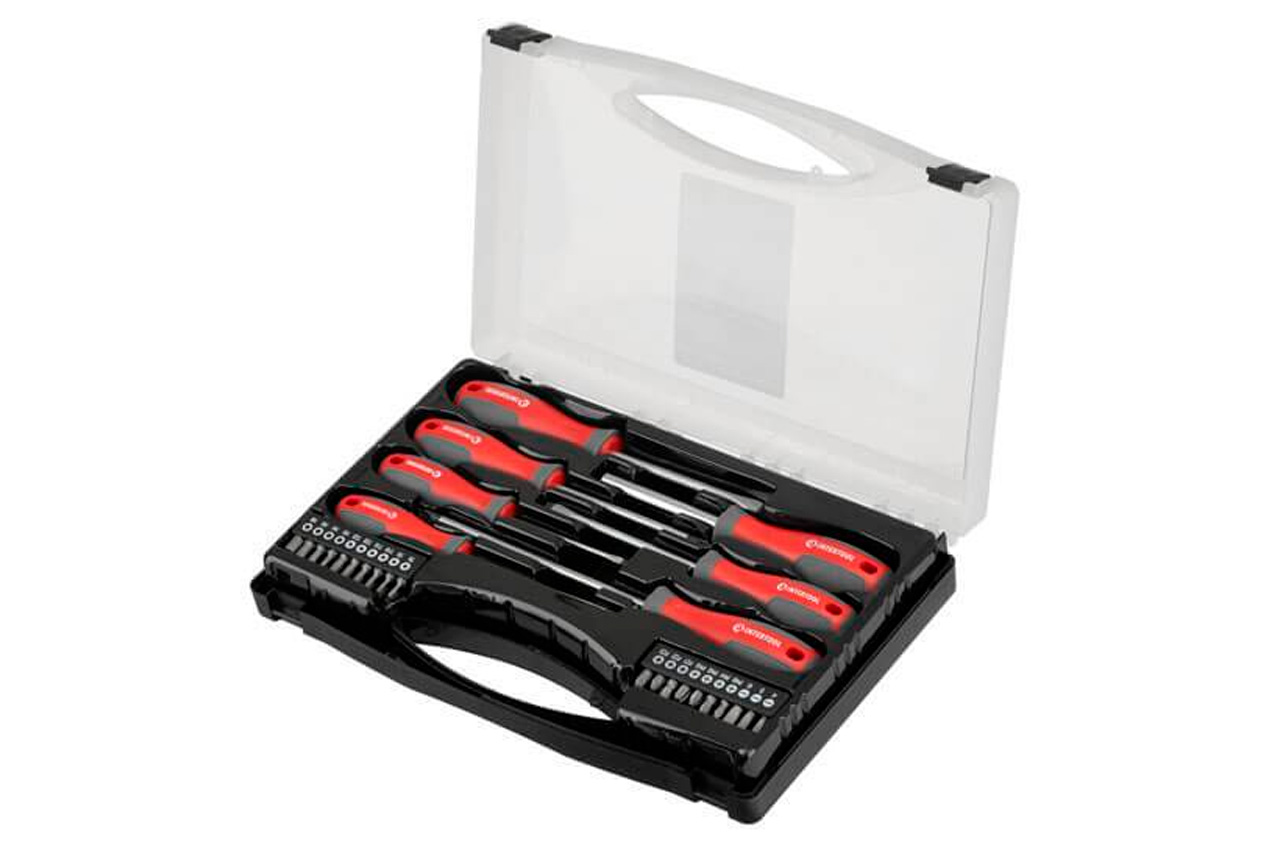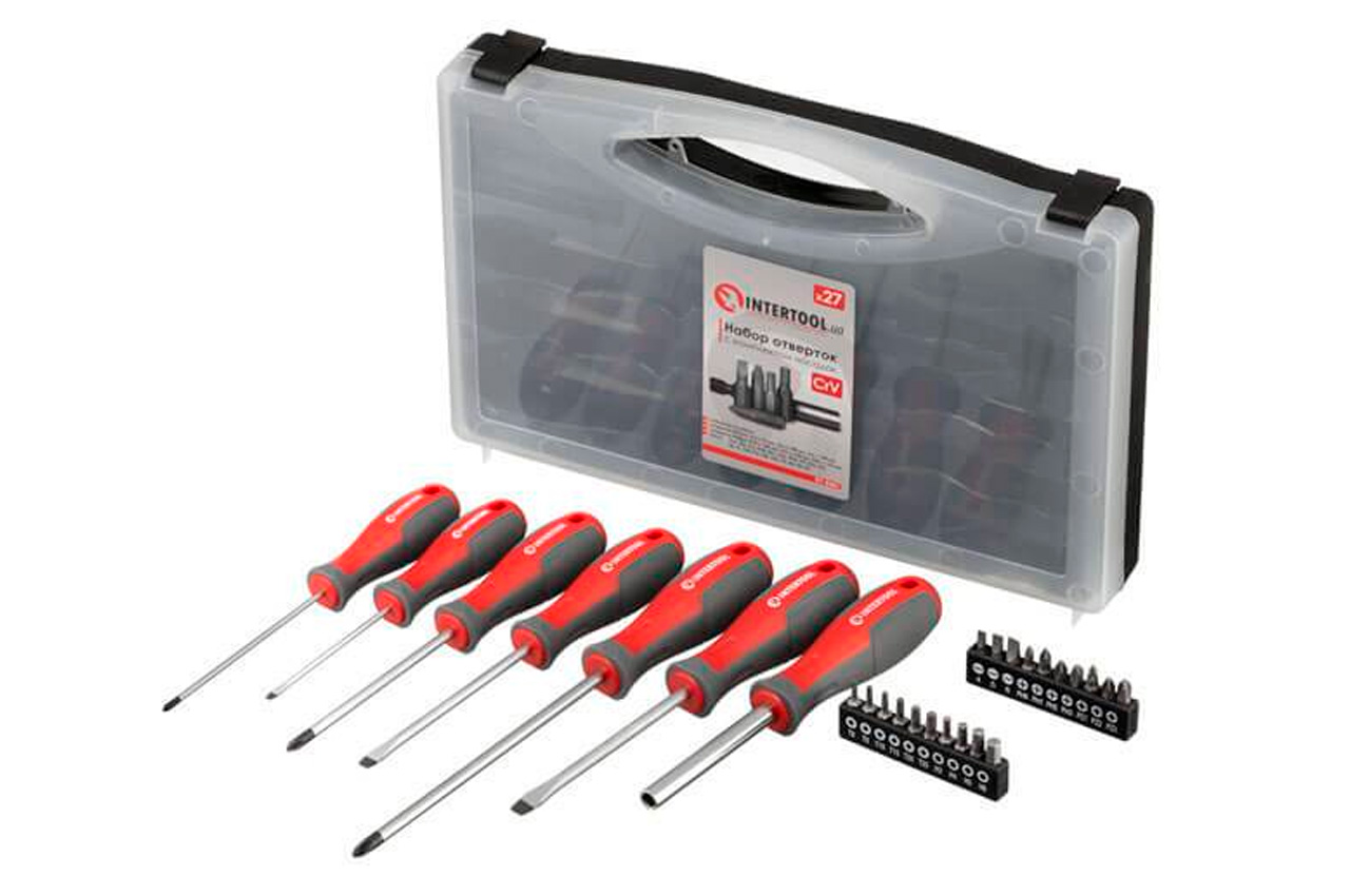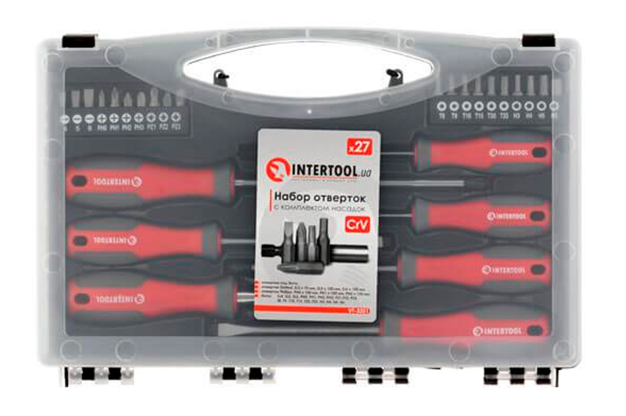 Набір викруток виготовлений за останніми технологіями і відповідає високим запитам майстрів. Призначений для монтажу і демонтажу різьбових з'єднань з різними типами шліцов. Даний комплект стане відмінним помічником в домашньому арсеналі інструменту, а також у власній майстерні, на виробництві. Висока якість стали Стрижень викруток і все насадки виготовлені з міцної Cr-V стали, яка відома всім майстрам своєю надійністю і витривалістю. У складі цієї стали присутні хром і ванадій, які надають виробу високу стійкість до зношування. Також сталь відрізняється довговічністю і не схильна до крихкого руйнування. Конструкція викруток продумана до дрібниць Стрижень глибоко посаджений в рукоятку і кріпитися в двох місцях, що виключає можливість зриву. Намагнічений наконечник Викрутки мають посилений магнітний наконечник, який утримує кріплення і полегшує роботу в важкодоступних місцях. Зручна рукоятка Форма ручок забезпечує максимальну ефективність від прикладеного зусилля. Прорезиненная двокомпонентна рукоятка зручно лежить в руці і не вислизає з долоні. Яскрава маркування на кінці рукоятки дозволяє швидко знайти необхідний тип і розмір викрутки. Кейс Набір укомплектований в компактний кейс (330 * 220 * 50 мм) з ручкою для транспортування і з двома засувками. Викрутки розміщені в власних осередках, біти знаходяться в власниках. При перенесенні нічого не випадає і не втрачається. Маркування біт в власниках дозволяє швидко відшукати необхідну насадку. Комплектація Викрутка з магнітним утримувачем для насадок 1/4 "100 мм; викрутки: SL3 * 75мм, SL5 * 100мм, SL6 * 100мм, PH2 * 150мм, PH1 * 100мм, PH0 * 100мм; біти: SL4, SL5, SL6, PH0, PH1, PH2, PH3, PZ1, PZ2, PZ3, T8, T9, T10, T15, T20, T25, H3, H4, H5, H6. Матеріал рукояток: двокомпонентні, прогумовані; Довжина викрутки: 75, 100, 150 мм; Кількість в наборі: 27 од.