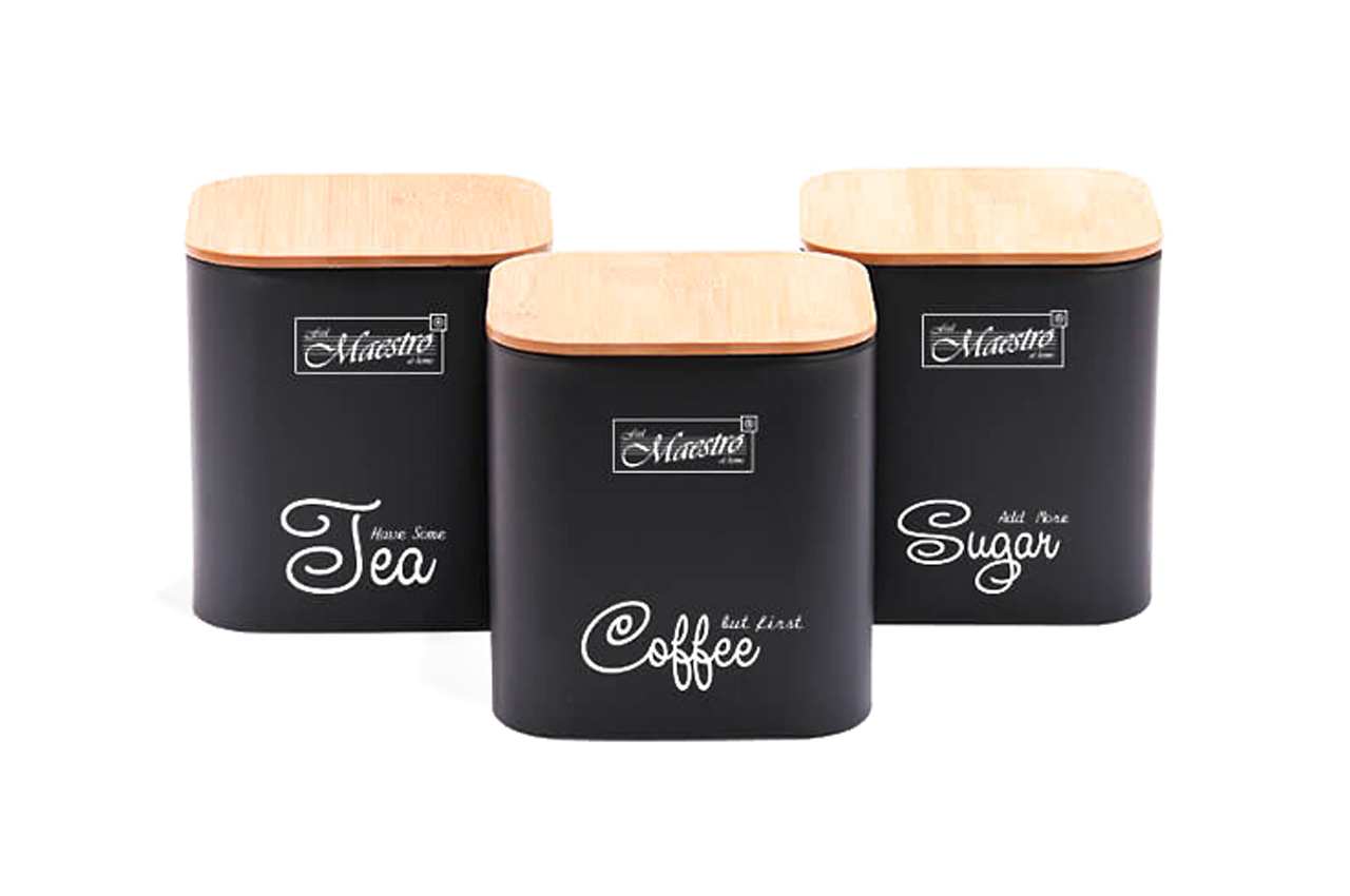 Набір Maestro MR-1775-3S-BLACK складається з трьох ємностей: - ємність для цукру - ємність для кави - ємність для чаю Металевий корпус із пудровим покриттям чудово поєднується з бамбуковою кришкою.