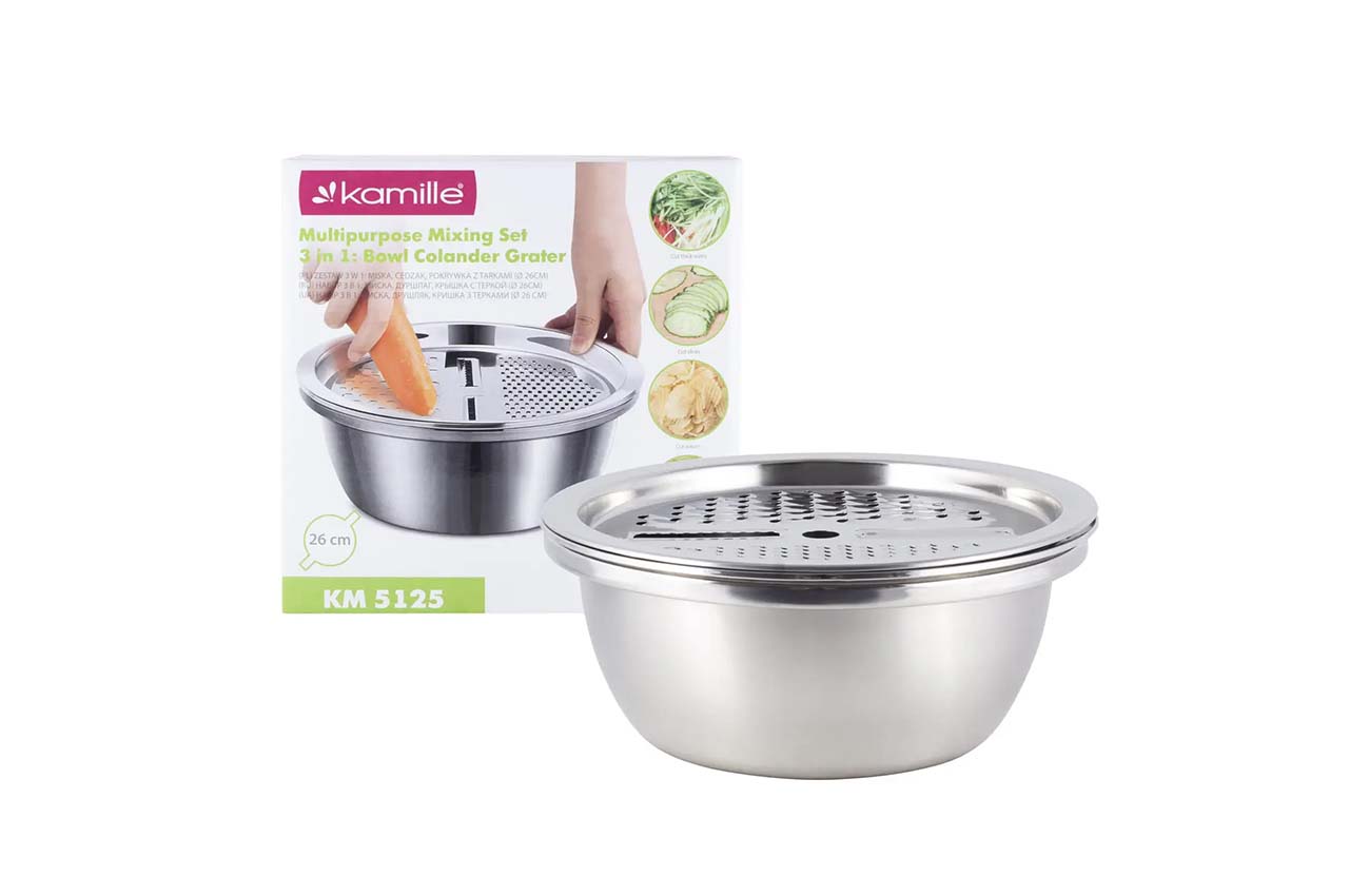 Набор мисок нержавеющих Kamille - 260мм миска x дуршлаг x крышка-терка