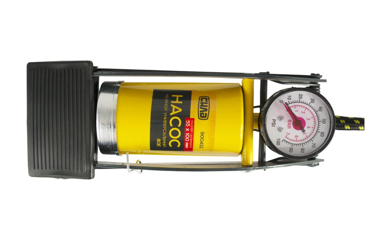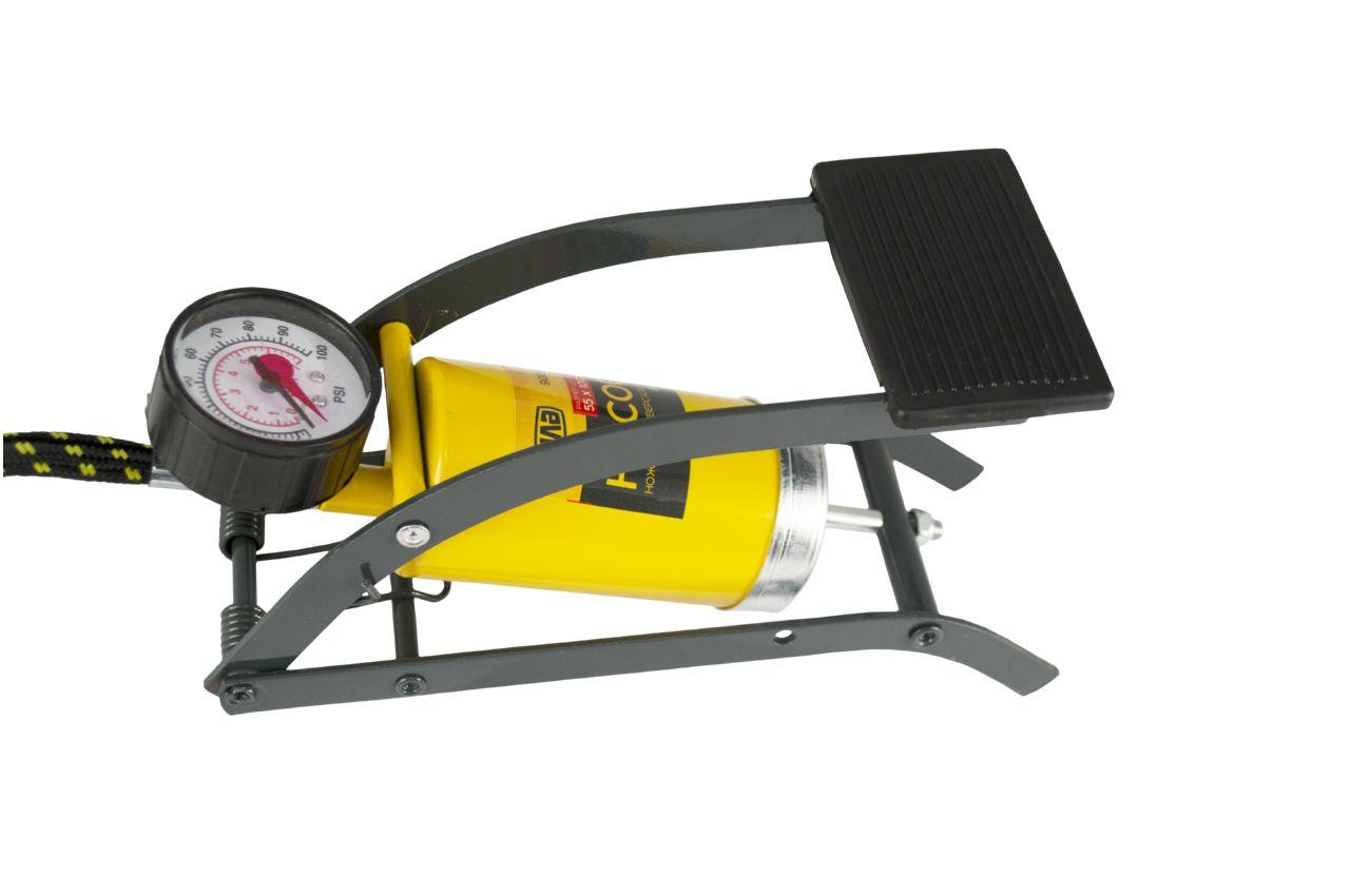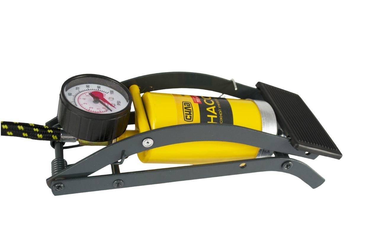Насос ножний однопоршневою Сила, для швидкого нагнітання повітря в автомобільні шини, велосипедні колеса або колеса мотоциклів. Манометр - аналоговий; кількість циліндрів - 1; розмір циліндра - 55 х 120 мм; максимальний тиск - 7 атм; довжина шланга - 55 см. Манометр: аналоговий; Матеріал циліндра: метал; Робочий об'єм циліндра: 240см³; Розмір циліндра: 55х100мм; Тип насоса: ножний