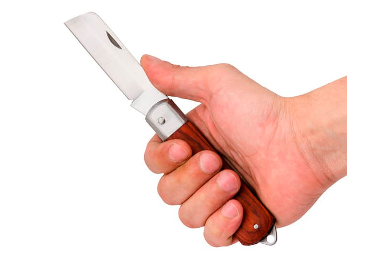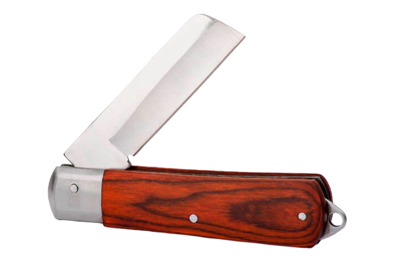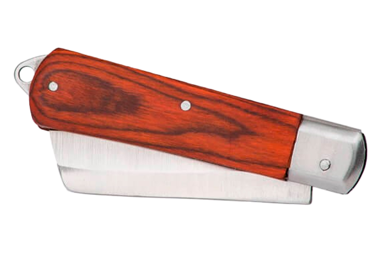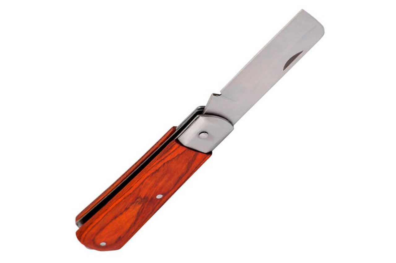 Монтерський ніж (ніж кабельщика) з прямим лезом HT-0560 приходить на допомогу при необхідності відрізати кабель або прибрати кабельну оболонку. Особливості Потужне гостре лезо (товщина 2 мм; довжина 85 мм) дозволяє впоратися навіть з товстими броньованими кабелями. Завдяки прямій формі клинка рези виходять рівні і акуратні. У відкритому стані надійно фіксується механізмом Slip joint. Комфортно лежить в руці навіть в холодну погоду т.к на металевій рукоятці встановлені дерев'яні накладки. Лезо товщиною 2 мм виконано з інструментальної сталі, не деформується і не гнеться. В руці ніж лежить зручно, завдяки відмінному балансу і якісної збірці. На задній частині розташувалася петля, за яку ніж можна підвісити на карабін. Відкривається легко, завдяки зацепу на лезі.
