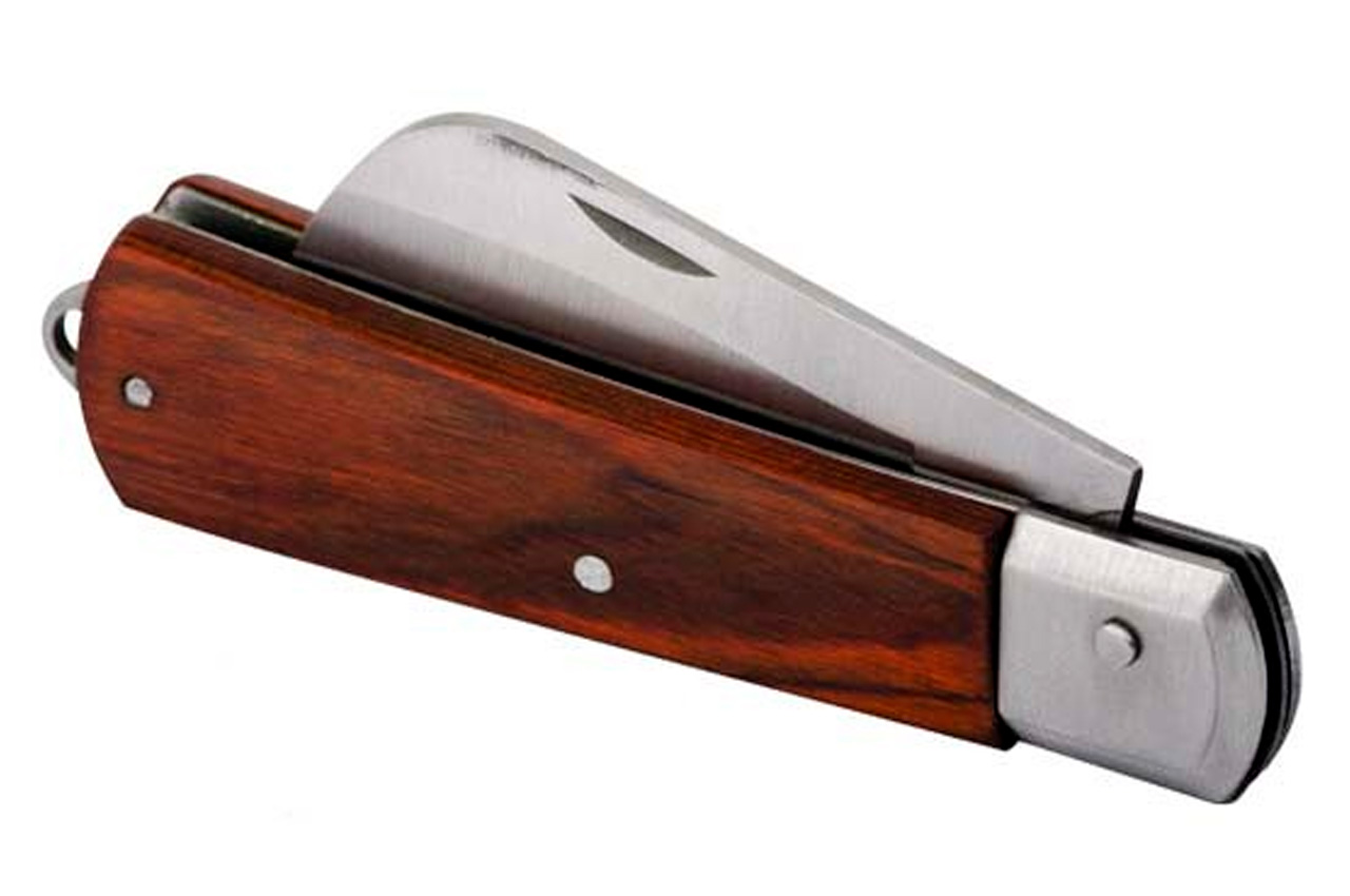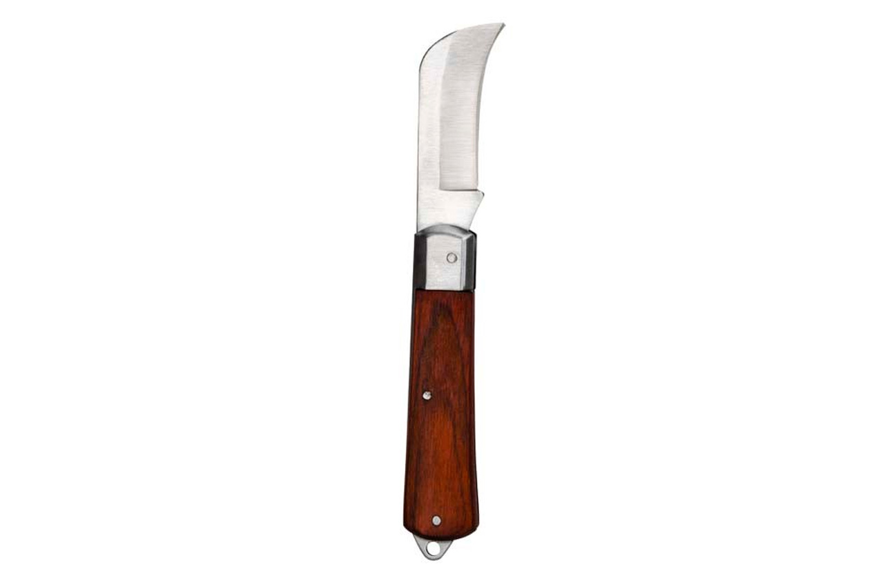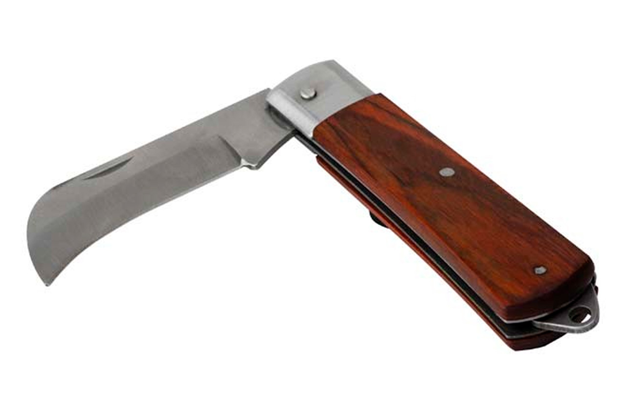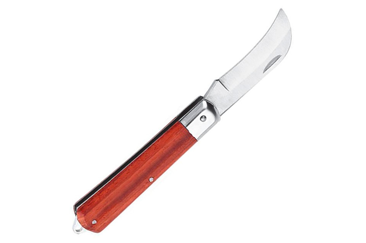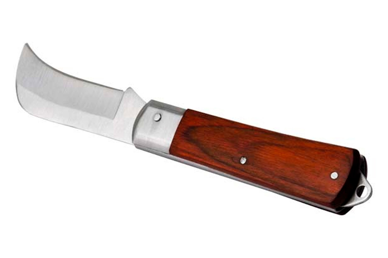 Монтерський ніж (ніж кабельщика) із зігнутим лезом HT-0561 приходить на допомогу при необхідності швидко зняти ізоляцію з кабелю. Особливості Потужне гостре лезо зігнутої форми (товщина 2 мм; довжина 75 мм) дозволяє швидко надрізати ізоляцію по всьому колу кабелю. У відкритому стані ніж надійно фіксується механізмом Slip joint. Комфортно лежить в руці навіть в холодну погоду т.к на металевій рукоятці встановлені дерев'яні накладки. Лезо товщиною 2 мм виконано з інструментальної сталі, не деформується і не гнеться. Спеціальна зігнута форма ідеально справляється з поставленими завданнями. В руці ніж лежить зручно, завдяки відмінному балансу і якісної збірці. Відкривається легко, завдяки зацепу на лезі. На задній частині розташувалася петля, за яку ніж можна підвісити на карабін.