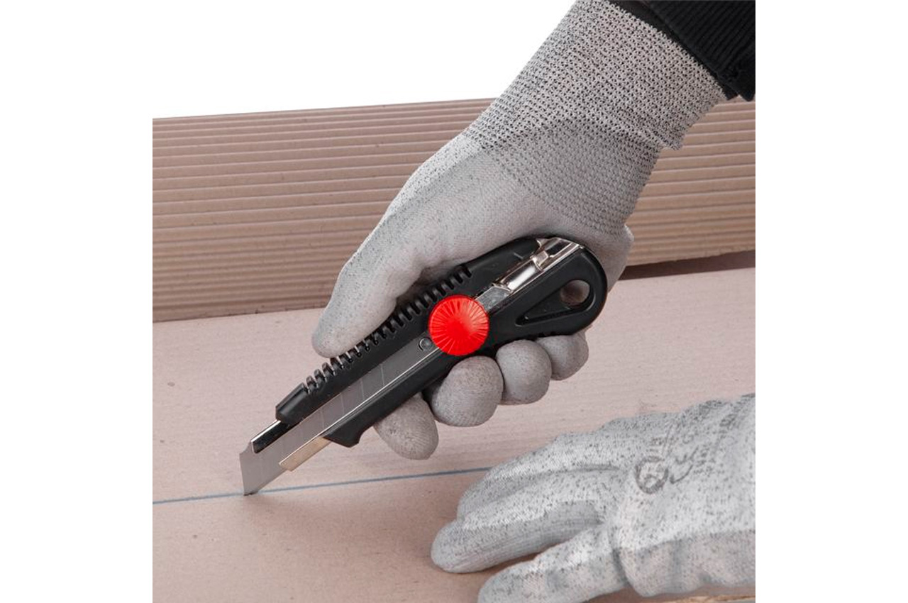 Ніж прорізний з пластмасовим перфорованим корпусом, посиленою сталевою направляє. Висування леза здійснюється за допомогою пластикового гвинта-фіксатора. Лезо ножа - змінне, сегментированное, шириною 18 мм. Ніж використовується при проведенні будівельних та оздоблювальних робіт для різання паперу, картону, бандажних стрічок та іншого матеріалу. Тип застосовуваного леза: лезо отломний; Матеріал корпусу: пластик; Ширина леза: 18 мм; Фіксатор: гвинтовий