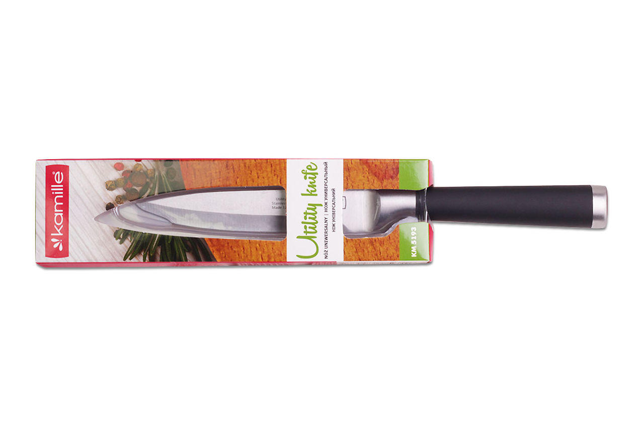 Ніж кухонний Kamille - це універсальний кухонний ніж, лезо якого виготовлено з високоякісної нержавіючої сталі, яка відрізняється міцністю і довговічністю, не схильна до корозії і впливу кислот, відповідає всім гігієнічним нормам і вимогам, не впливає на смак і проста в догляді.