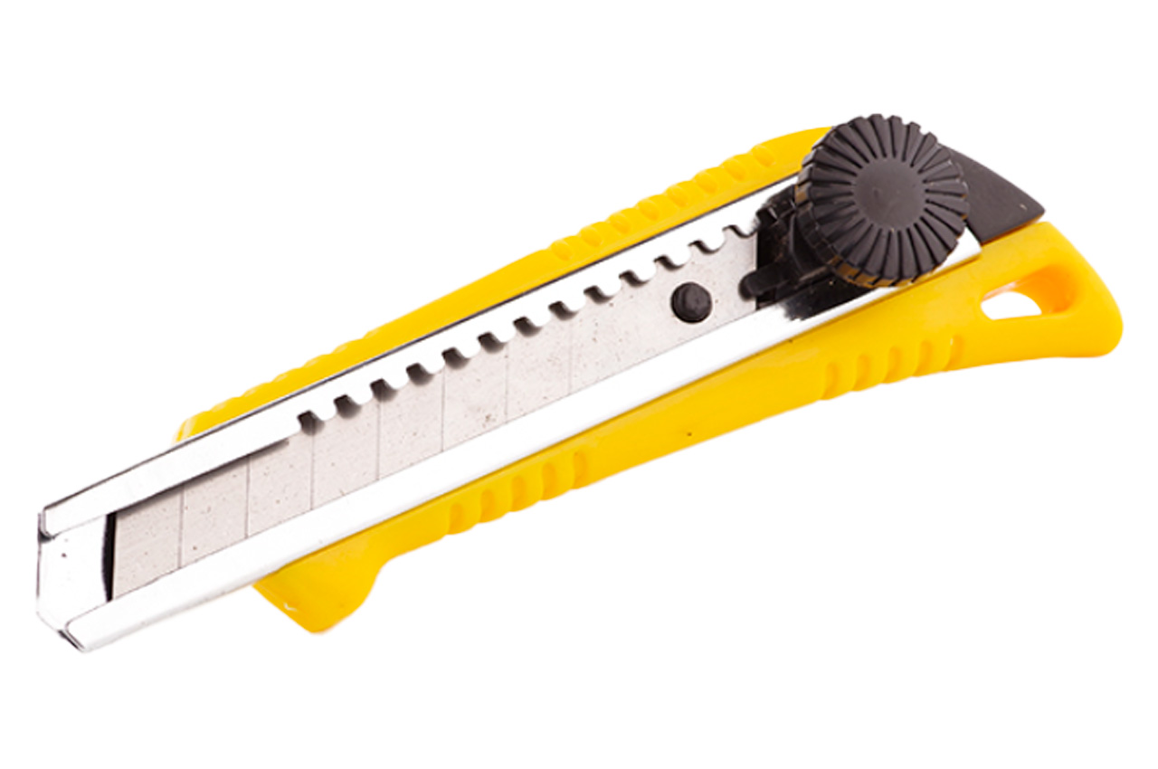 Ніж висувною з металевої напрямної. Матеріал корпусу - пластик. Призначений для розрізання паперу, картону та інших матеріалів із застосуванням значних зусиль. Має ергономічний пластиковий корпус, металеву направляючу, механізм автоматичної фіксації сегментованого змінного леза шириною 18 мм.