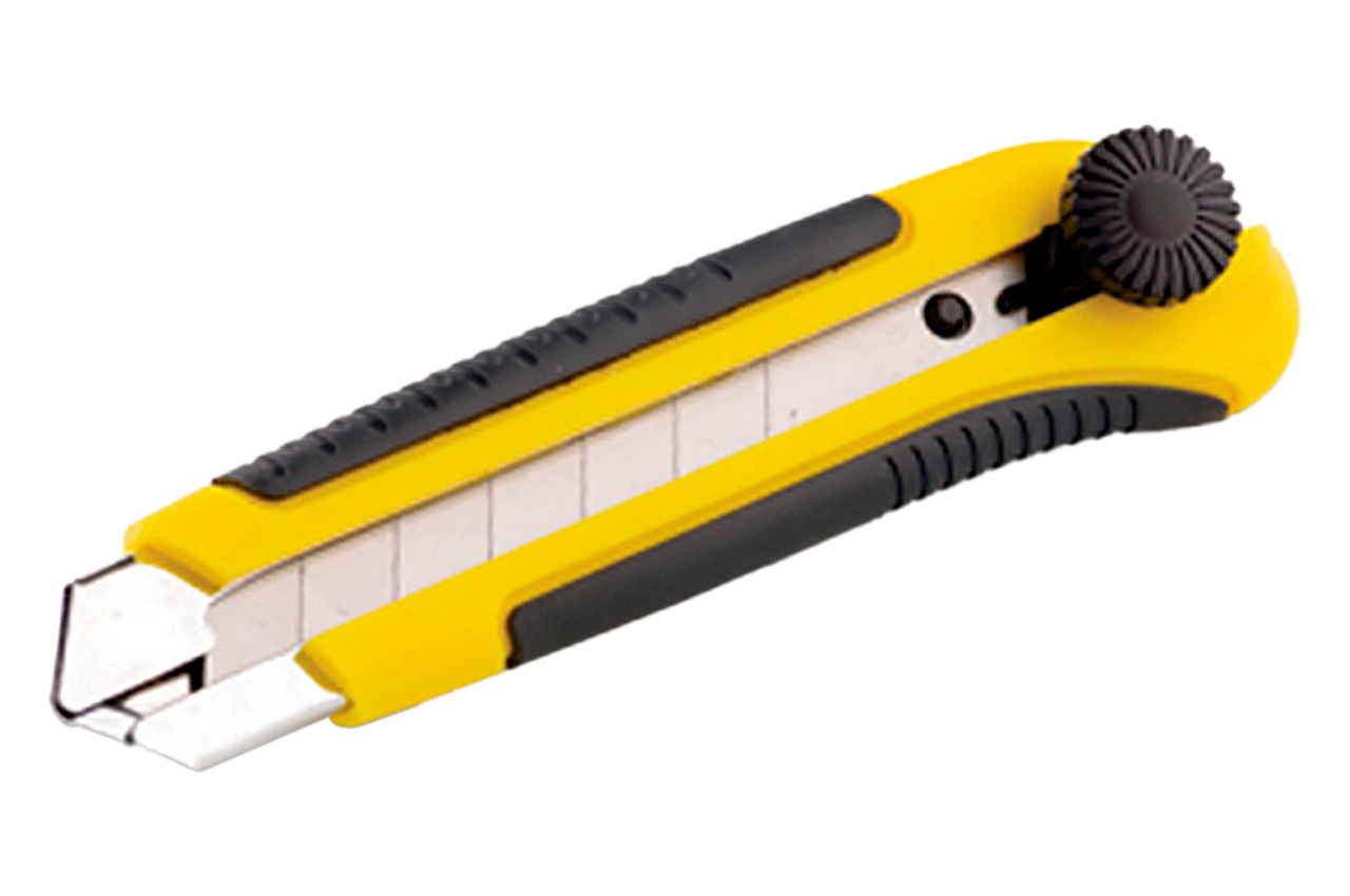 Ніж з відламуються лезом для роботи з лезами шириною 25 мм. Металева напрямна забезпечує довгий термін служби. Фіксуючий гвинт підвищує комфорт користування. Корпус ергономічної форми, покритий антиковзаючим матеріалом, забезпечує комфорт і безпеку під час роботи.
