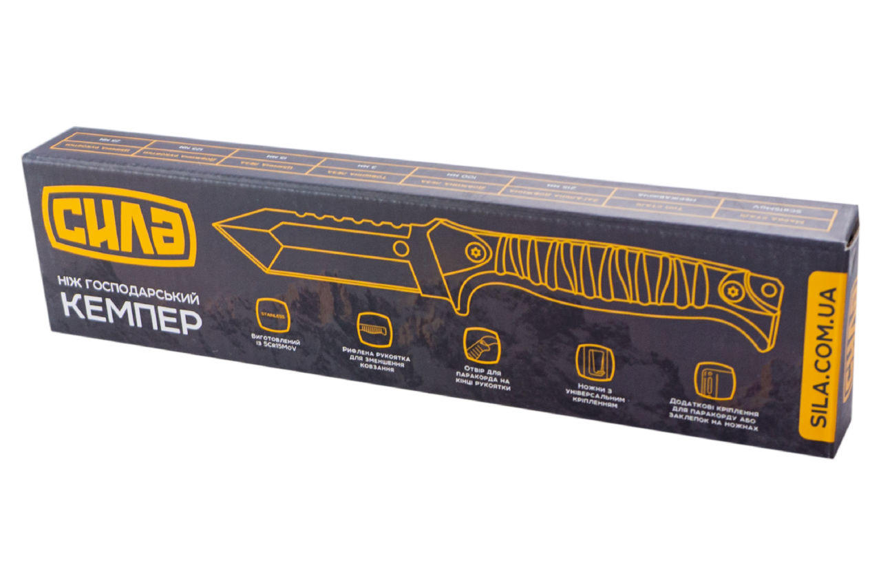 Ніж туристичний сила - кемпер. Своєю компактністю добре підходить для щоденного використання у місті або як похідний інструмент та просто для зручного носіння в кишені. Лезо ножа виготовлене з нержавіючої сталі 5Cr15MoV. Ніж має просту конструкцію, він міцний, надійний та безпечний. Цей ніж не є холодною зброєю. Загальна довжина 215 мм. Товщина леза 3 мм. Ширина леза 15 мм.
