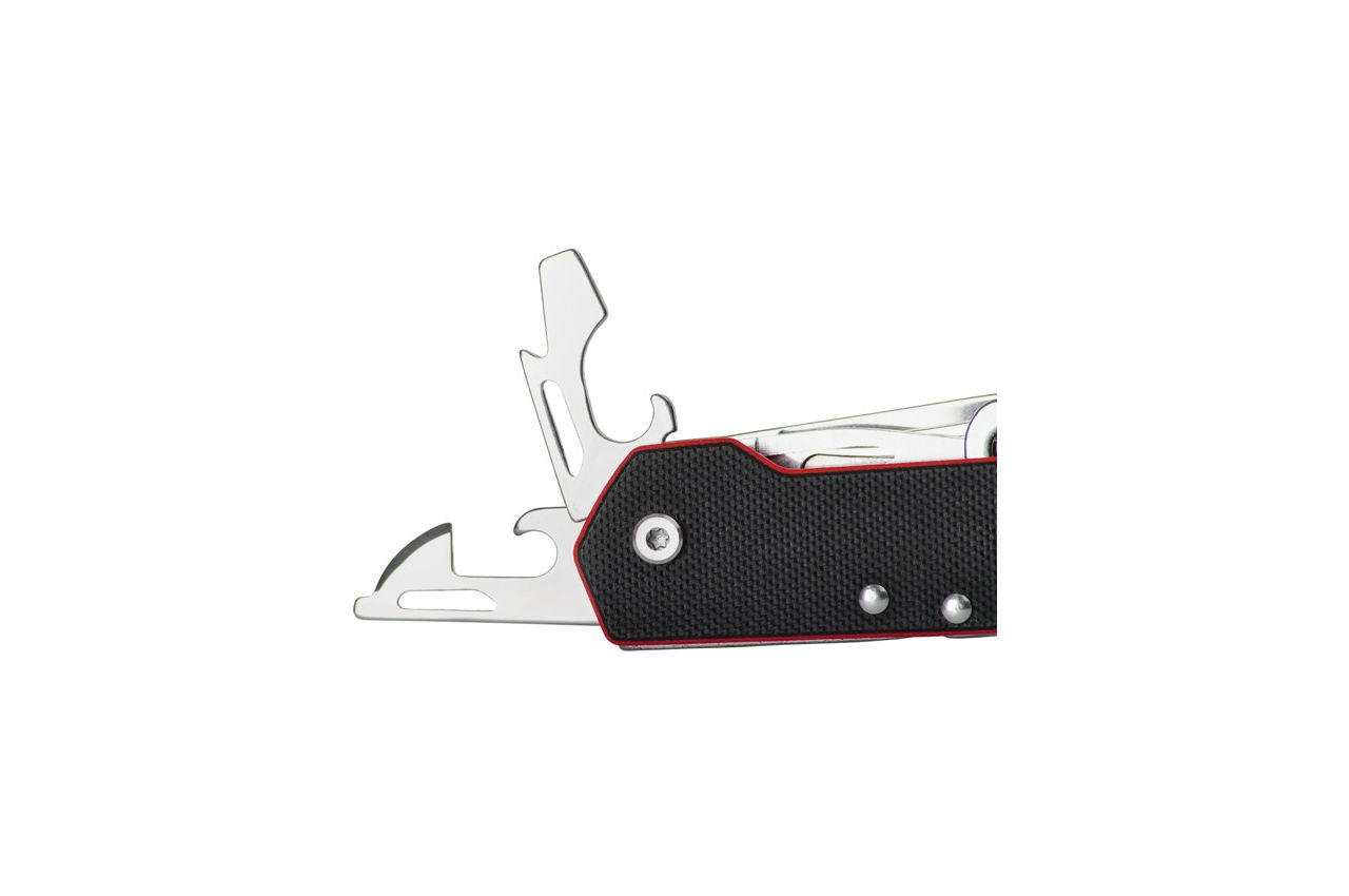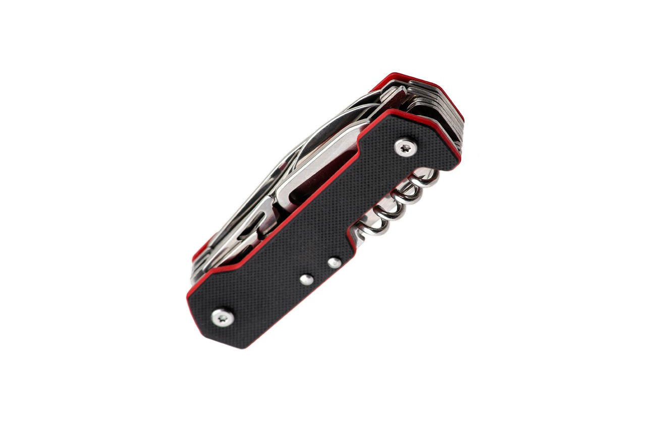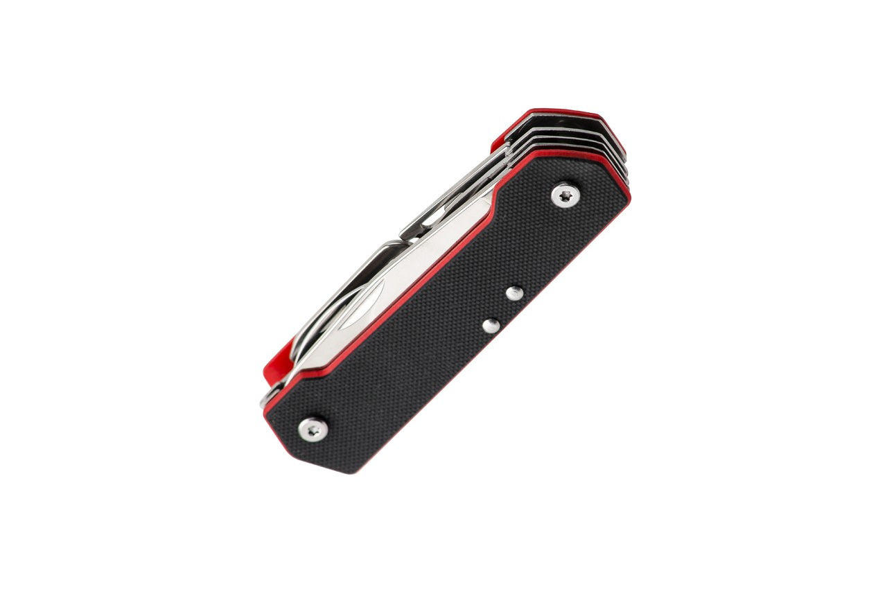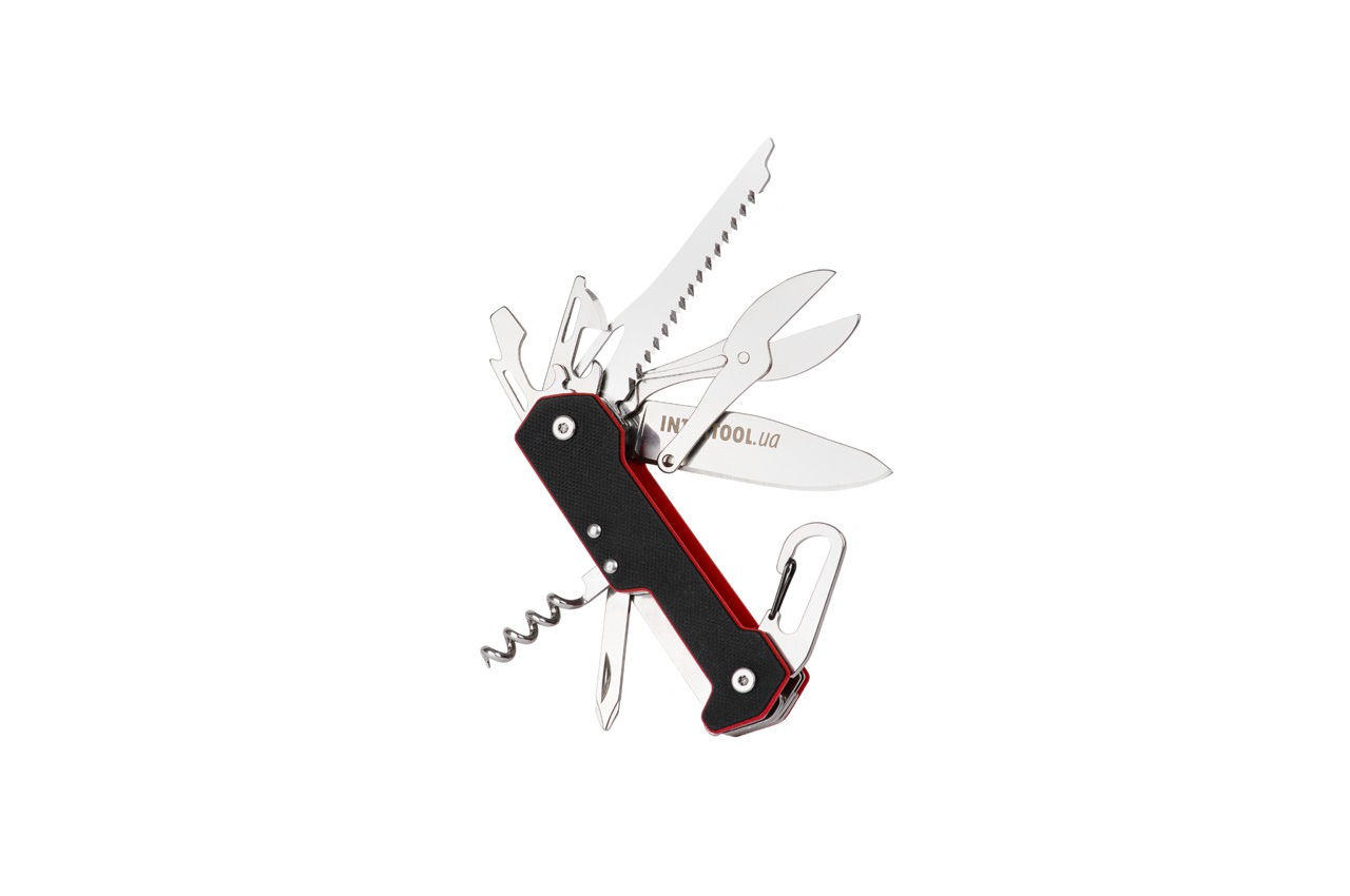 Ніж складаний HT-0597 - це відмінний помічник в побуті і на природі. Підходить всім любителям активного відпочинку і не тільки! Чи стане прекрасним подарунком для автомобіліста, рибалки, дачника, велосипедиста і туриста. Всі інструменти виготовлені зі сталі 420 - стійкою до появи корозії, також володіє відмінними ріжучими якостями. Інструменти жорстко фіксуються в корпусі без люфту. Грані всіх насадок міцні, витримують максимальні навантаження і не стираються під час роботи. Замок в цій моделі простий і не вимагає додаткових зусиль для складання ножа. Досить натиснути на обух, і він закриється. Спейсер (підпирають частина на ручці) вберігає від випадкового закриття леза. Ручка ножа з накладками з сучасного шорсткого композиту G10 зручно лежить в руці і запобігає ковзанню в мокрих або брудних руках. Відрізняється високою міцністю і надійністю. Практичний і багатофункціональний ніж не займе багато місця в кишені або бардачку. Наявність 9 функцій робить його незамінним в побуті або коли під рукою немає цілого арсеналу інструментів. Особливості Міцна 420я сталь служить набагато довше інших сплавів, завдяки підвищеній стійкості до появи корозії і міцності; Зручна ручка, не вислизає і щільно прилягає до долоні за рахунок накладок з склотекстоліти G10; Швидкий і легкий доступ до будь-якого інструменту, за допомогою зарубок на інструментах; Можна носити як брелок, за допомогою карабіна на торці рукоятки. * Не є холодною зброєю Інструменти: ножножніциштопорпілка по деревуотвертка SLотвертка PHоткривалка для консервовоткривалка для бутилоккарабін ;; Тип замка: Slip joint; Товщина рукоятки: 16 мм; Матеріал клинка: нержавіюча сталь; Довжина в складеному вигляді: 97 мм; Довжина леза: 72 мм; Загальна довжина: 165 мм; Матеріал рукоятки: сталь G10 з накладками