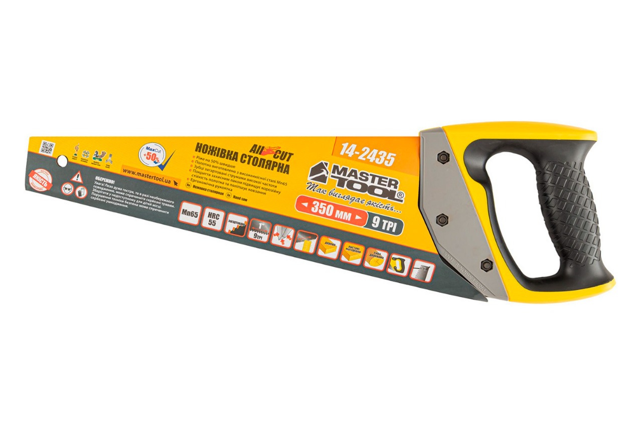 Ножівка по дереву Mastertool - 350мм x 7T x 3D. Застосовується для розпилу заготівок середніх розмірів з деревини м'яких і твердих порід, ДСП, фанери та ПВХ. Основні переваги: • полотно зі сталі Мn65 • зуби загартовані струмами високої частоти • твердість HRC 55 • 3D заточка зубів • 7 зубів на 1 дюйм • пластикова ручка з TPR-покриттям