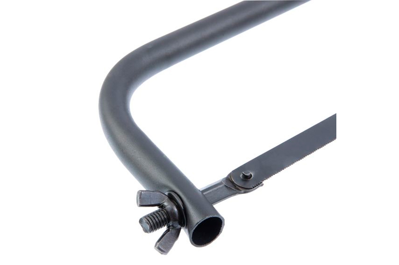 Ножівка по металу з полотном 250-300 мм має сталеву раму прямокутного перетину з ручкою з металу. Полотно натягується і фіксується за допомогою спеціального гайкового механізму. Установка полотна можлива під кутом 90 °. Матеріал рукоятки: метал