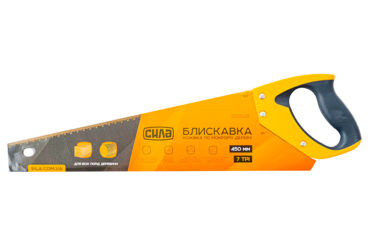 Ножівка по мокрому дереву Сила - 450 мм x 7T x 3D блискавка незамінний інструмент для поздовжнього та поперечного розпилу заготовок середніх та дрібних розмірів деревини з м'яких та твердих порід, ДСП, фанери та ПВХ. Завдяки своїм характеристикам та особливостям, ця ножівка забезпечує високу ефективність та точність роботи.