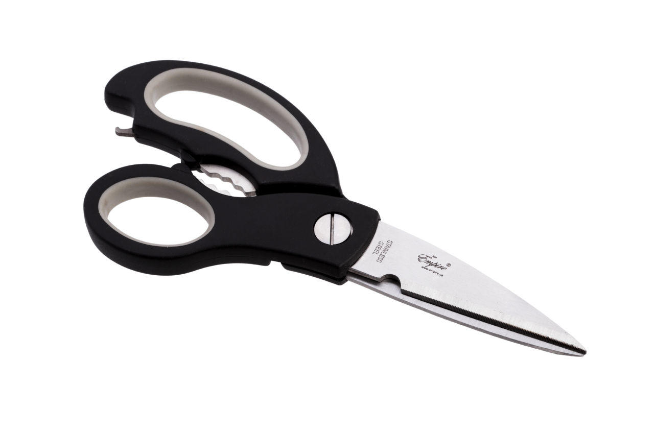 Універсальні кухонні ножиці Empire загальною довжиною 230 мм знадобляться для швидкої нарізки будь-яких продуктів: будь то філе лосося або, наприклад, пучок зеленої цибулі. Виготовлені з високоміцної нержавіючої сталі, вони проявляють підвищену стійкість до ударів і подряпин. Сам матеріал в реакцію з інгредієнтами не вступає, але головне, не притуплює їх іонами металу і не змінює смаку. Особливістю моделі є 2 надгострий леза сталевого кольору. Вони роками зберігають початкові показники твердості, не тьмяніють і не псуються під дією різких температурних перепадів.