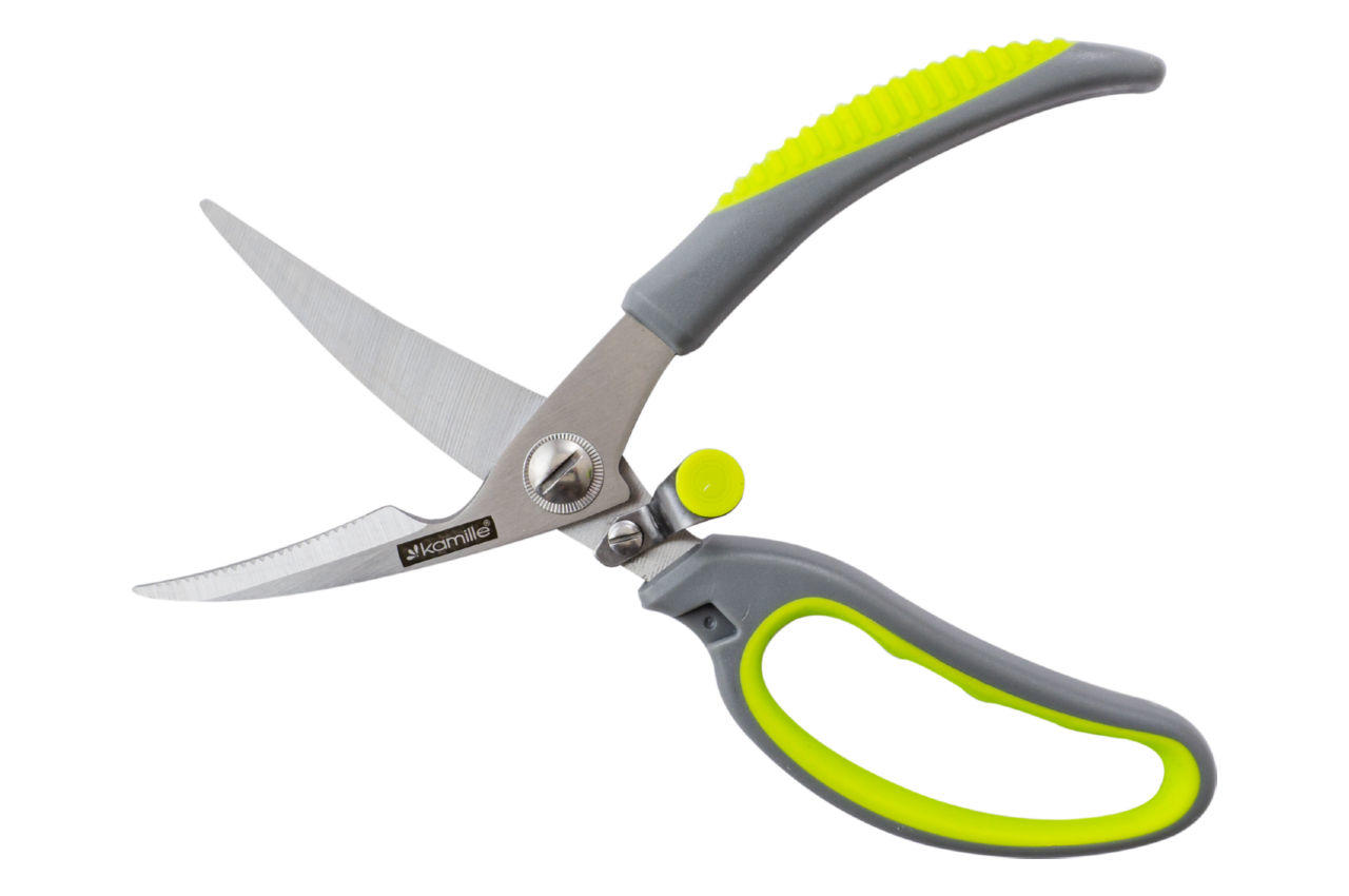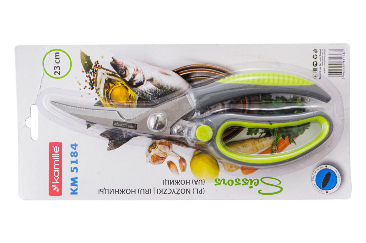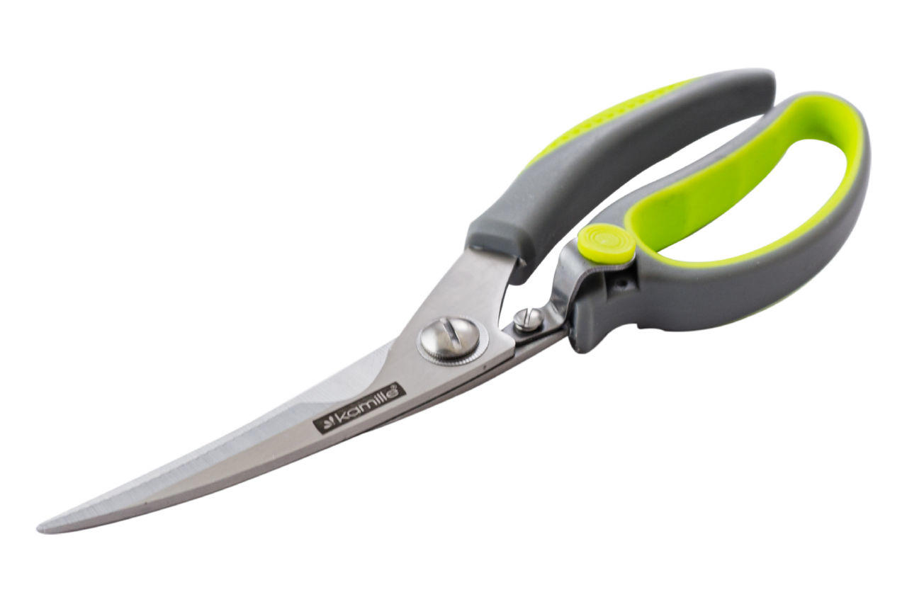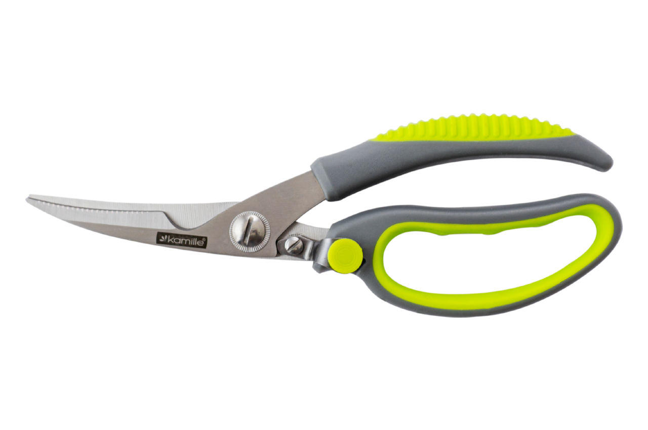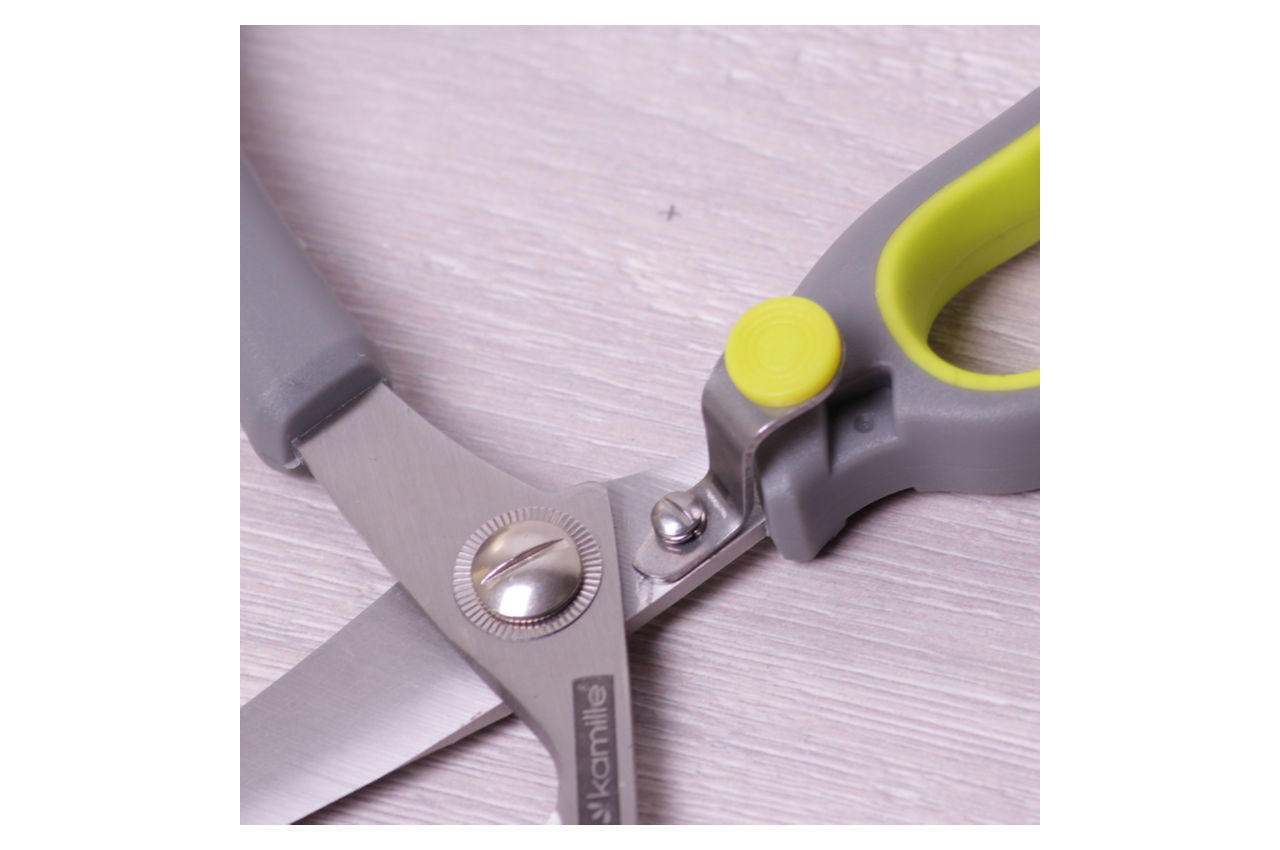 Ножиці кухонні Kamille виготовлені з якісних матеріалів із використанням сучасних технологій. Вони мають міцний механізм і оснащені спеціальними антиковзаючими вставками на ручках, завдяки чому вони не ковзатимуть у руці. У застосуванні ножиці Kamille досить прості та зручні і неодмінно прослужать Вам дуже довгий час.