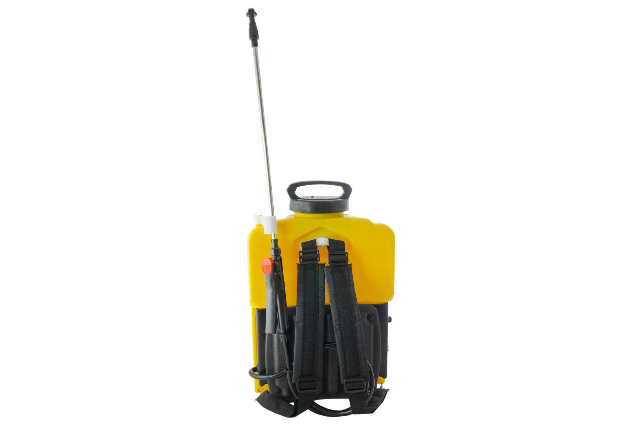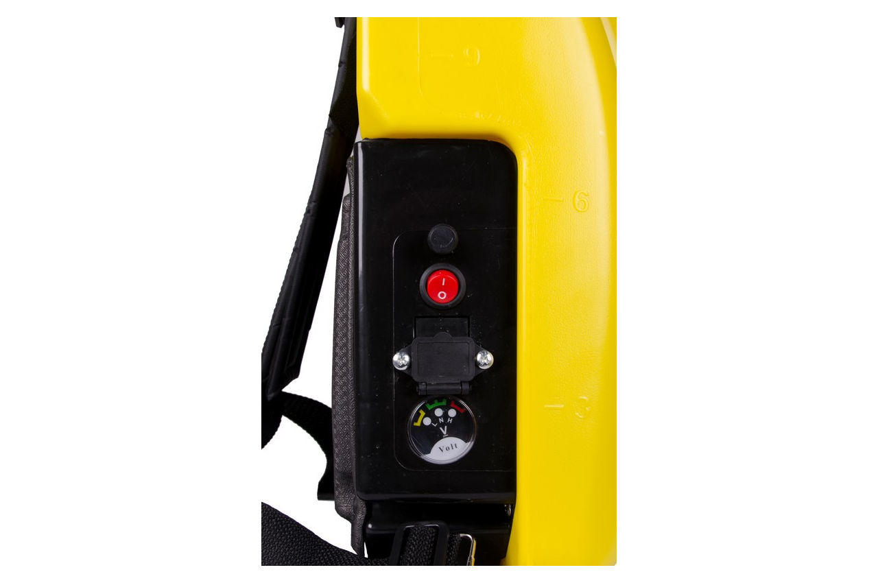 Матеріал бака - ударостійкий поліетилен ергономічна накладка на бак сталева телескопічна трубка 48-82 см гумовий шланг 1,2 м 4 насадки: душова 7 см, душова регульована 2,5 см, туманоутворюючих подвійна, віялова 2 фільтра регульовані лямки комплект запасних ущільнювачів акумуляторна батарея 12V , 8Ah зарядний пристрій 110-220V, 50-60Hz час повної зарядки 8-12 годин час безперервної роботи 2-3 години індикатор рівня заряду акумулятора робоча рідина: розчин отрутохімікатів і дезінфікуючих засобів, вода вага - 5,5 кг