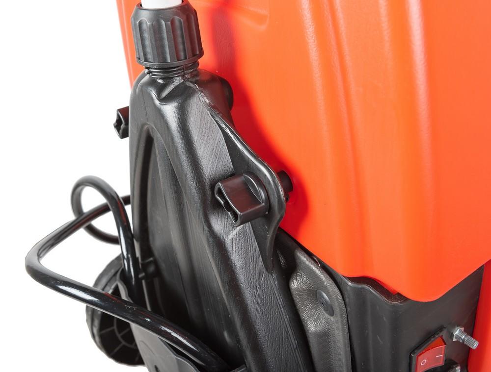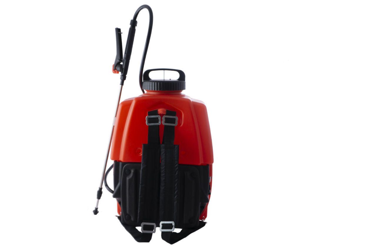Матеріал бака – ударостійкий поліетилен; сталева телескопічна трубка 48-82 см; гумовий шланг 1,2 м; 5 насадок: душова 7 см, душова регульована 2,5 см, туманоутворююча подвійна, віялова, щітка для миття; 2 фільтри; регульовані лямки; комплект запасних ущільнювачів; акумуляторна батарея 12V, 8Ah; зарядний пристрій 110-220V, 50-60Hz; час повної зарядки 8-12 годин; час безперервної роботи 2-3 години; індикатор рівня заряду акумулятора; робочий тиск 2,5-4,5 бар; робоча рідина: розчин отрутохімікатів та дезінфікуючих засобів, вода; візок для зручного транспортування; вага 8 кг