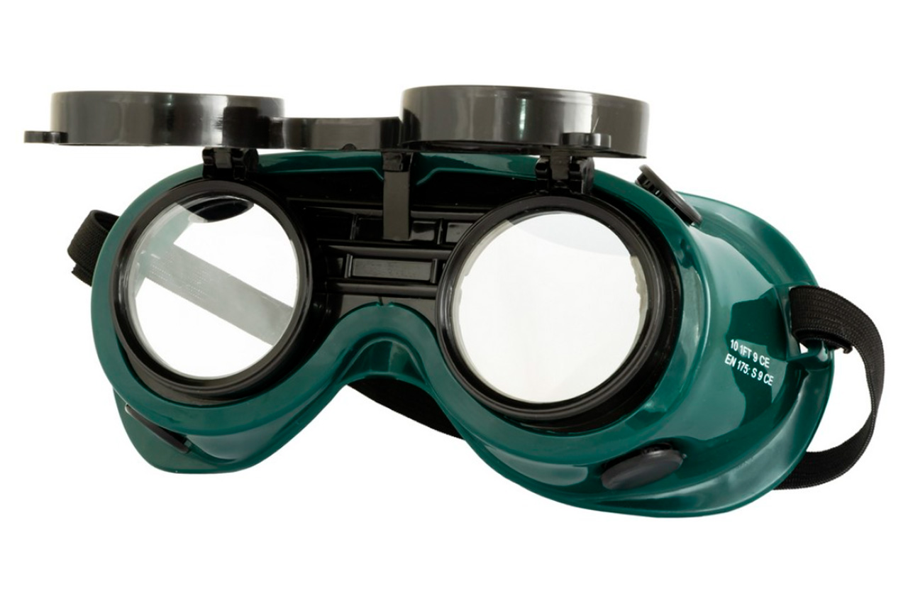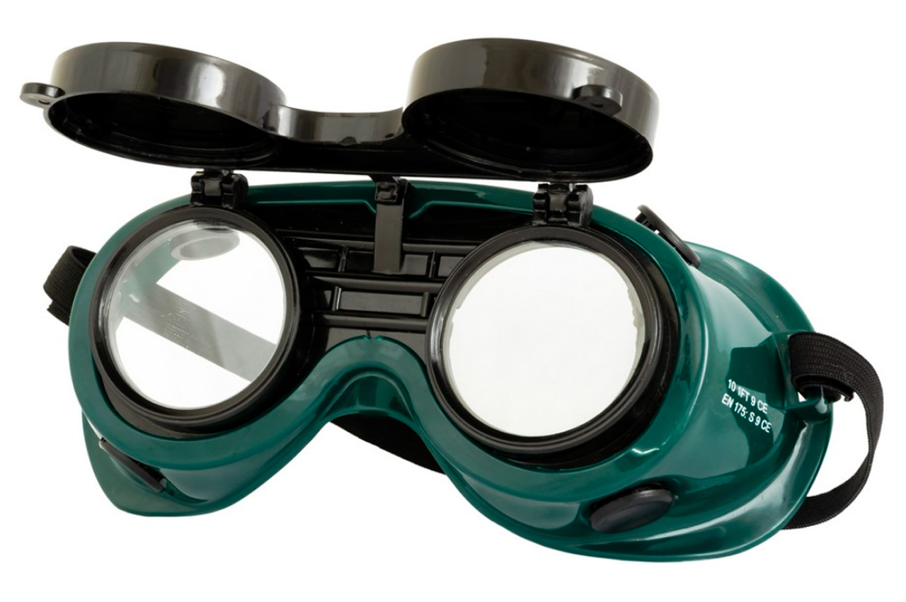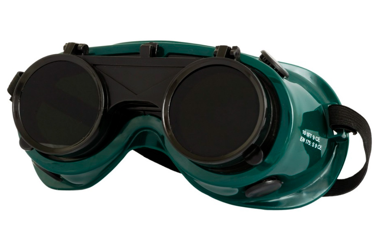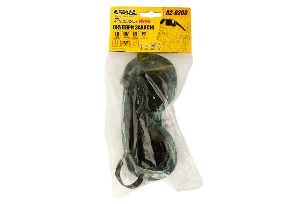 Окуляри мають відкидні захисні стекла середньої затемненості, виготовлені з полікарбонату, друга пара - із силікатної скла. Еластична регульована гумка для щільного прилягання до голови. Призначені для захисту очей від сліпучої яскравості світла, ультрафіолетового, інфрачервоного випромінювань і від впливу твердих частинок. Лінзи круглі.