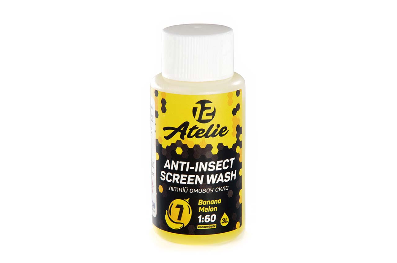 Омивач скла антимошка 12 Atelie - призначений для усунення з поверхонь фар головного світла і лобового скла слідів комах та інших забруднень, що важко виводяться. Є сильно концентрованим засобом і вимагає розведення в пропорції 1:60, даної баночки вистачить на 3 літри розчину.