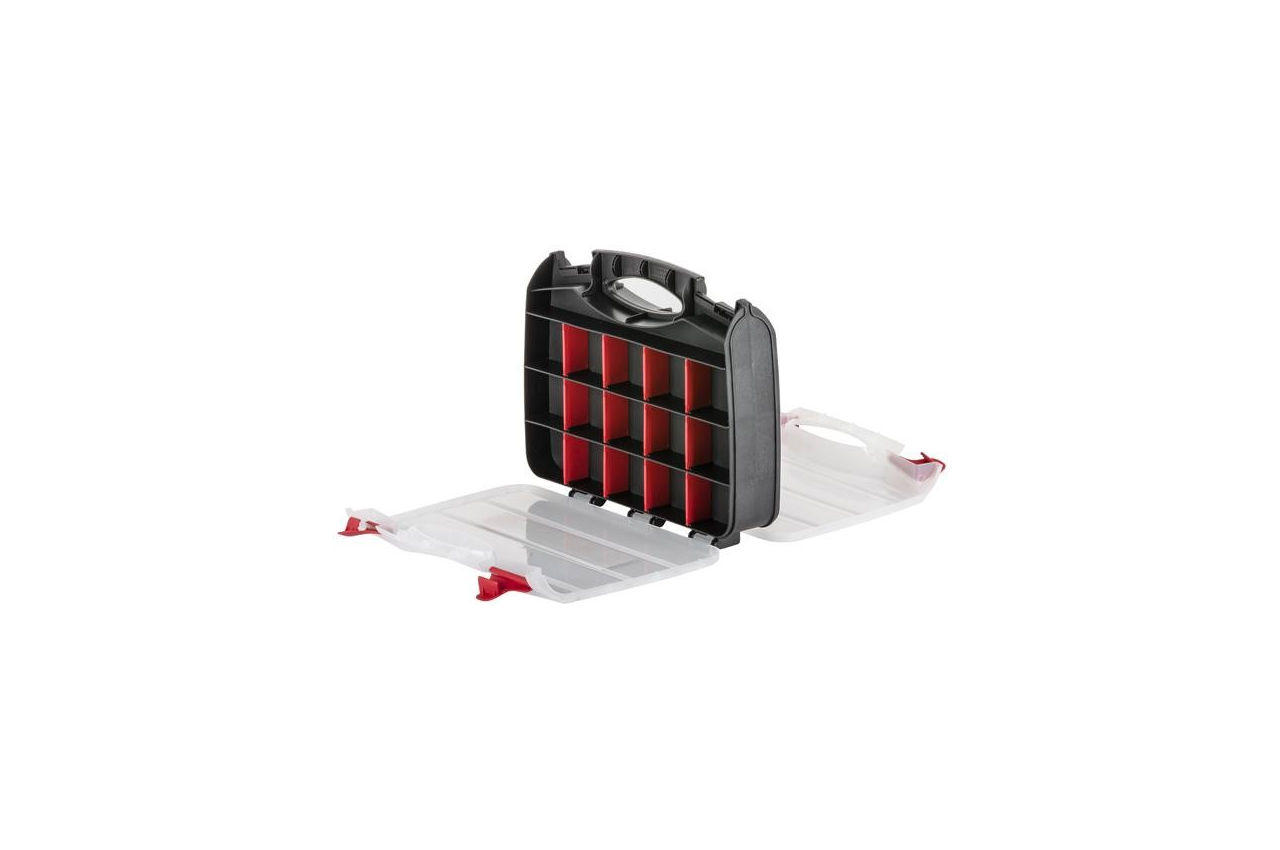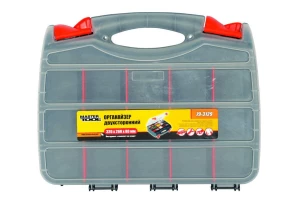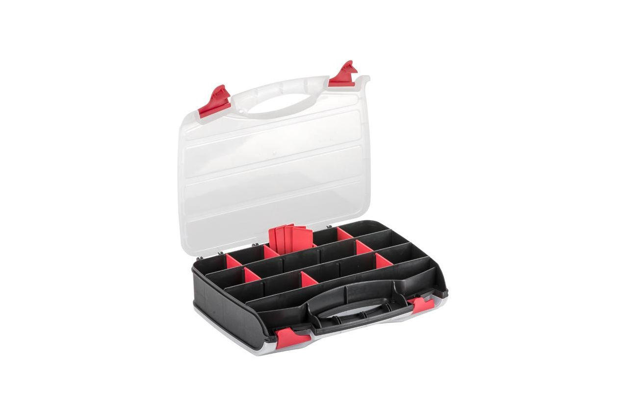 Організатор 12,5 "2-в-1 (кейс з осередками по обидва боки) має габаритні розміри 320х260х80 мм. Виконаний з міцного пластику з прозорими кришками. Всі поперечні перегородки знімаються. Габаритні розміри: 320x260x80 мм