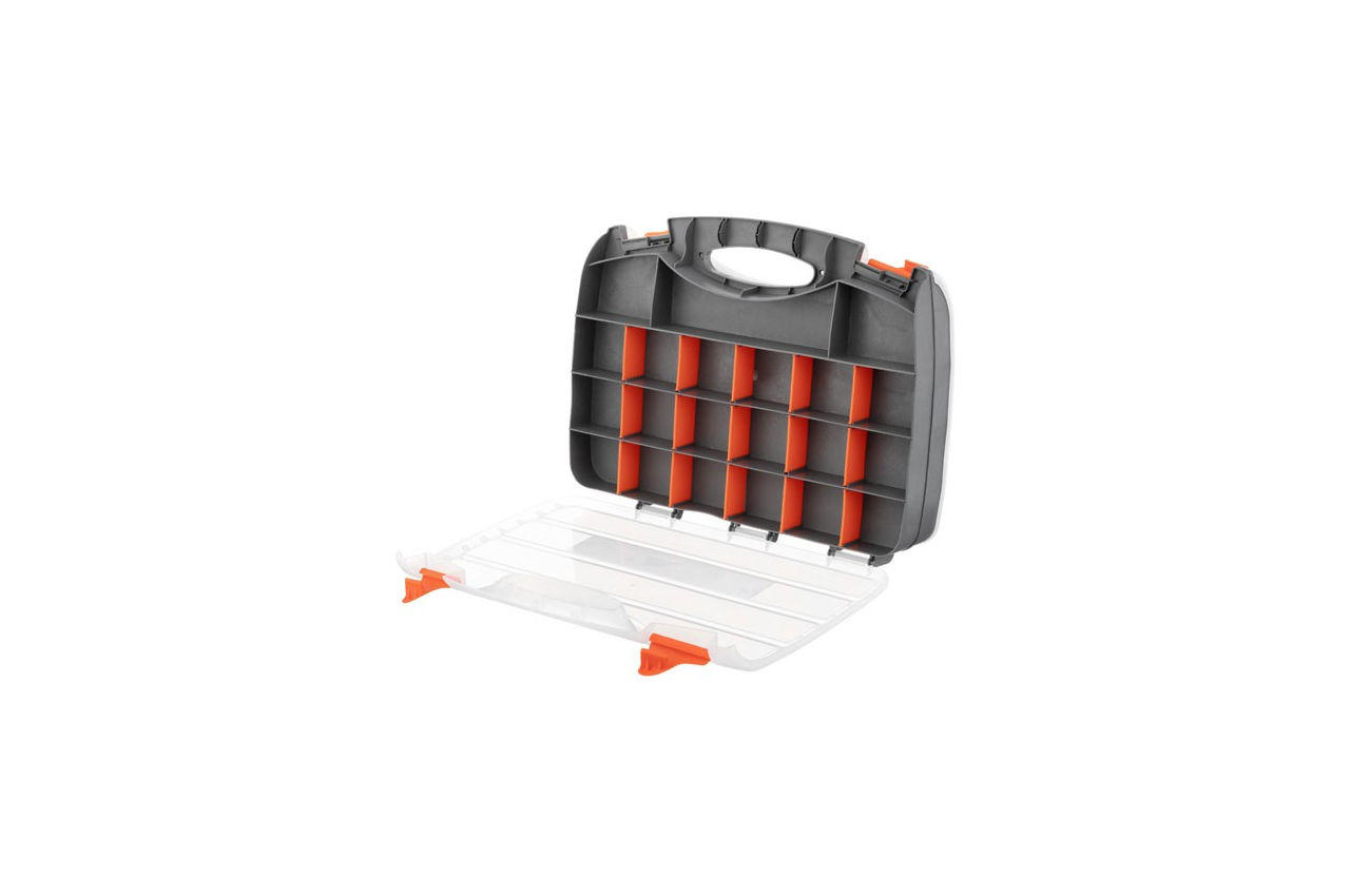 Двосторонній органайзер INTERTOOL BX-4005 дозволяє зберігати та транспортувати вдвічі більше підручних інструментів та предметів. Використовується для металовиробів і дрібних деталей, кріпильних елементів, фурнітури, запчастин, рибальського приладдя та інших дрібниць. Габаритні розміри: 380x290x80 мм
