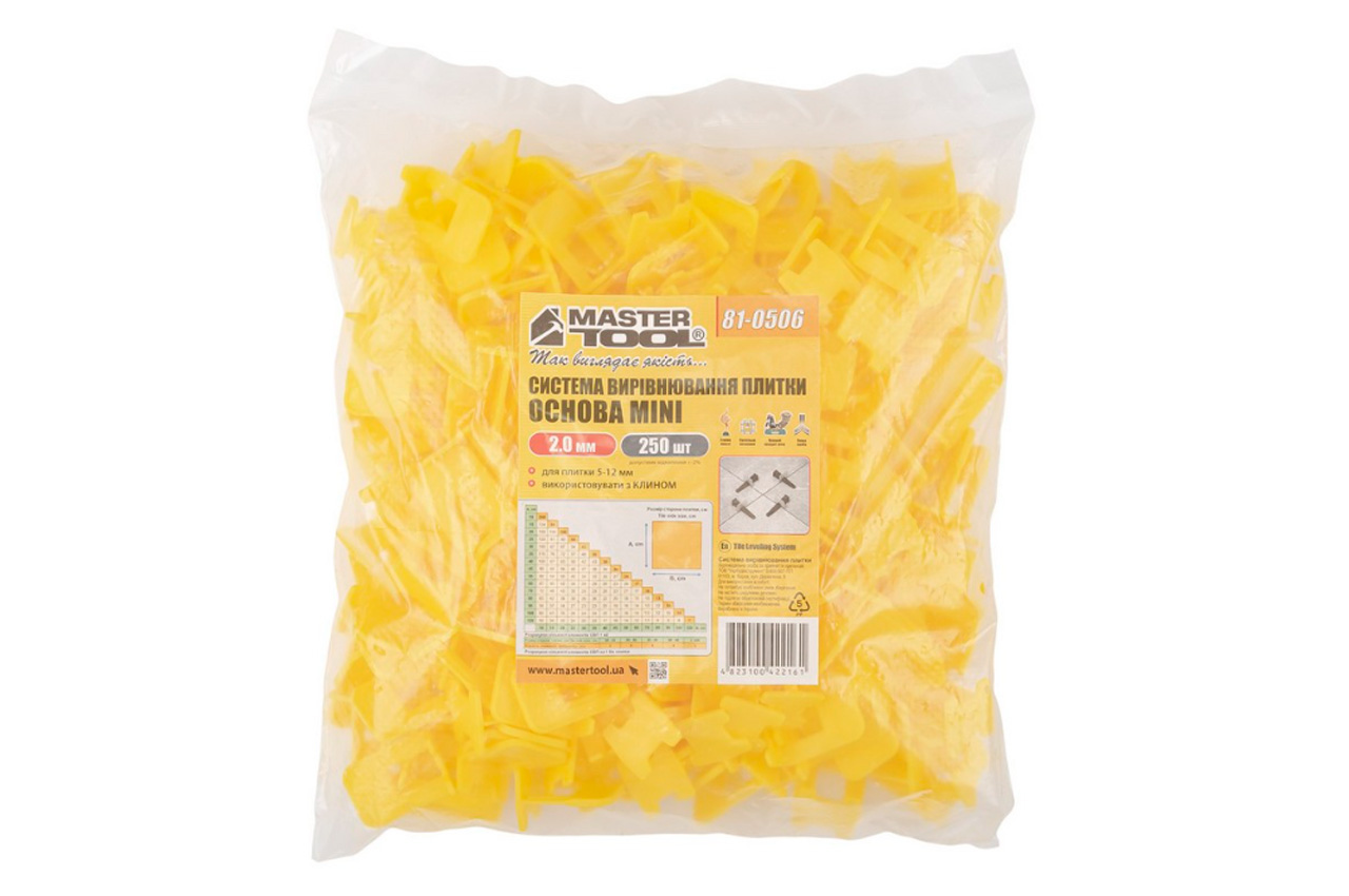 Основа для вирівнювання підлог Mastertool - це матеріал для одноразового використання, що встановлюється між плитками під час їх укладання. Товщина основи складає 2 мм, що дозволяє створювати ідеальні міжплиткові шви відповідної ширини. Поставляються упаковками по 250 шт.