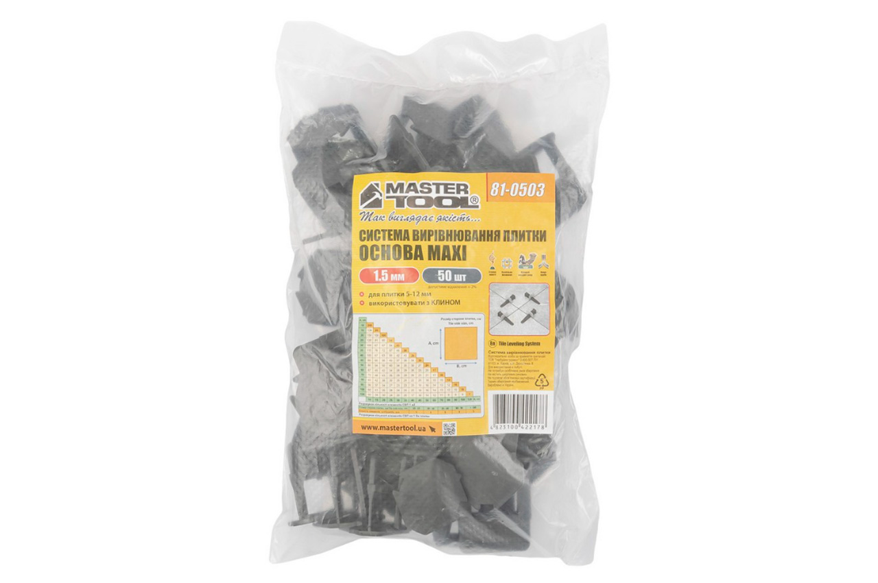 Підстава для вирівнювання підлоги Mastertool – це матеріал для одноразового використання, що встановлюється між плитками під час їх укладання. Товщина основи становить 1,5 мм, що дозволяє створювати ідеальні міжплиткові шви відповідної ширини. Постачаються упаковками по 50 шт.