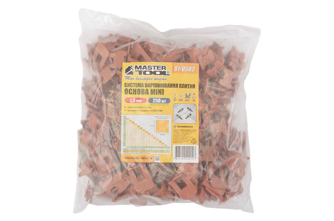 Основа для вирівнювання підлог Mastertool - це матеріал для одноразового використання, що встановлюється між плитками під час їх укладання. Товщина основи складає 1,5 мм, що дозволяє створювати ідеальні міжплиткові шви відповідної ширини. Поставляються упаковками по 250 шт.