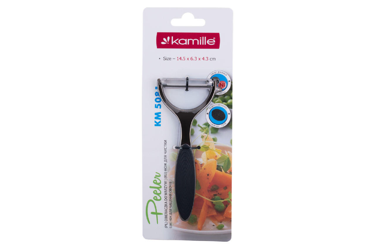 Зручний ніж для чищення овочів Kamille стане незамінним помічником для кожної господині. З його допомогою Ви зможете в лічені секунди очистити овочі або фрукти, а його стильний дизайн прекрасно впишеться в інтер'єр Вашої кухні.