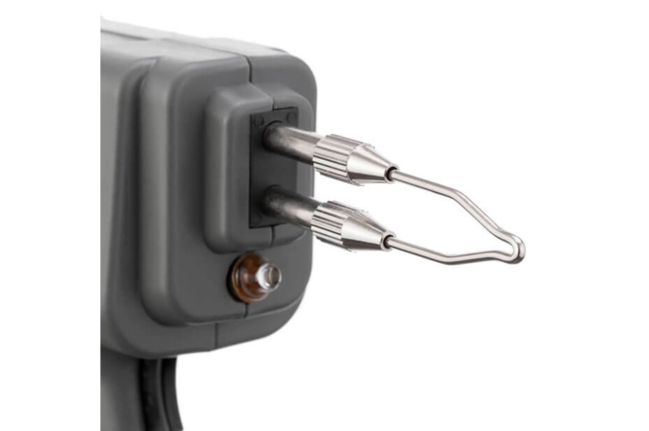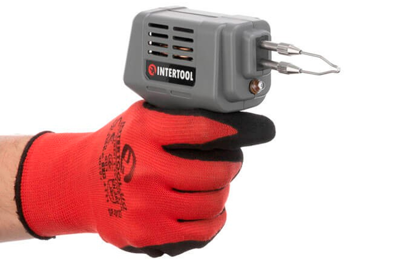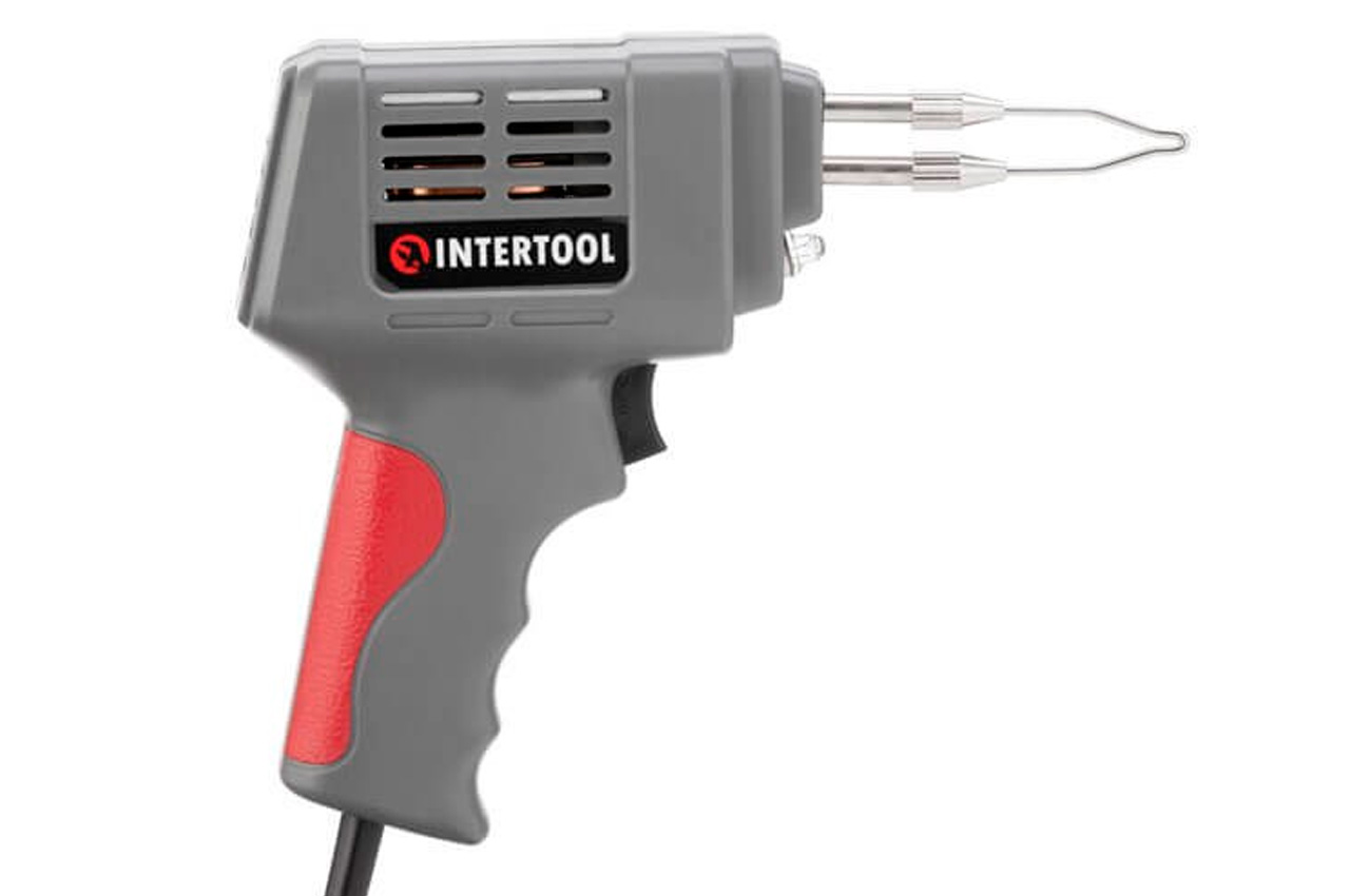 Паяльник імпульсний "Intertool" трансформатором потужністю 100 Вт призначений для монтажу або демонтажу елементів і вузлів електронних і електротехнічних виробів. Як нагрівальний елемент застосовується жало зі сталевого дроту. Струм через жало пропускається тільки під час пайки, тому імпульсний паяльник споживає вкрай мало електроенергії. Жало кріпиться за допомогою гвинта. Даний паяльник оснащений світлодіодом для підсвічування місця пайки, а корпус виконаний з термостійкої ударопрочной пластмаси. Напруга живлення: 230 В; Потужність: 100 Вт