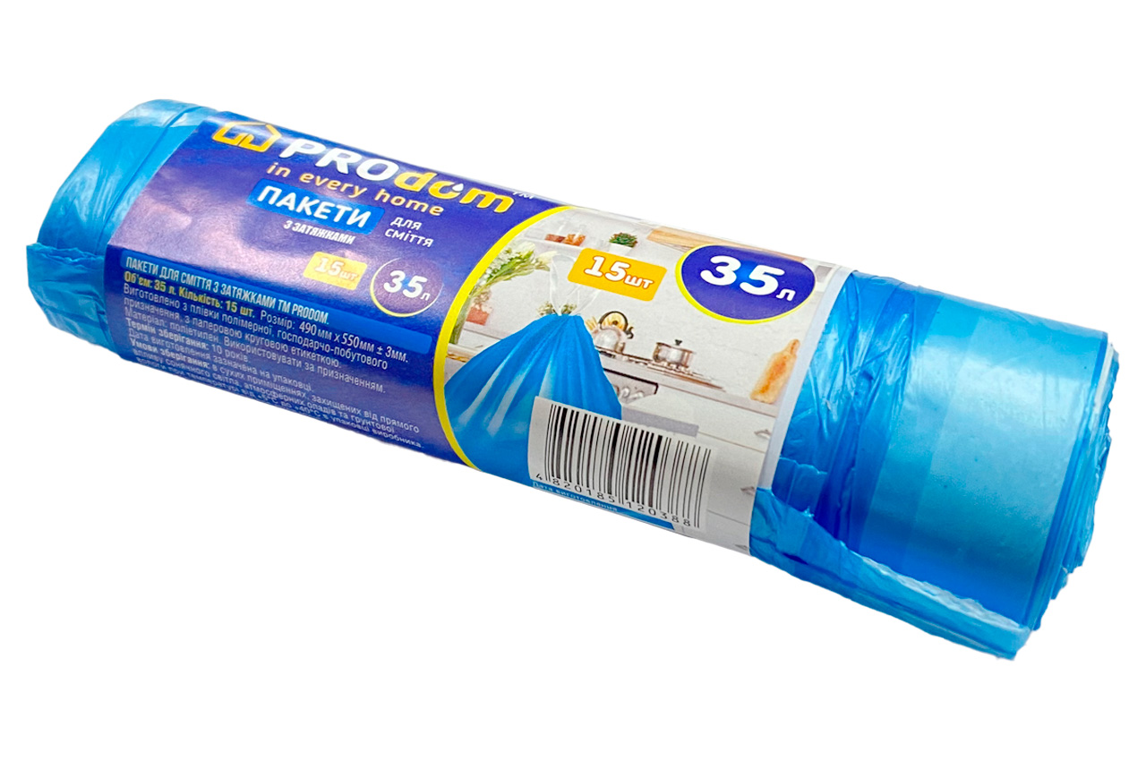 Міцні поліетиленові пакети об’ємом 35 л із зручними зав’язками для щільного закривання. У наборі 15 штук. Ідеально підходять для домашнього, офісного або виробничого використання. Стійкі до розривів і протікання, забезпечують зручність збору та утилізації сміття.