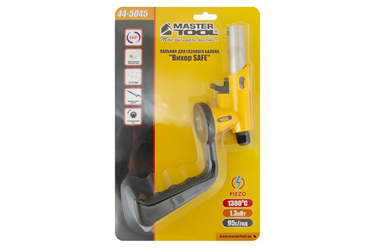 Пальник газовий з п'єзопідпалом Mastertool - ⌀22мм вихор Safe. Призначений для проведення ремонтних робіт, застосовується в кулінарії. t=1300°С. Діаметр - 22 мм. Довжина сопла - 64 мм.