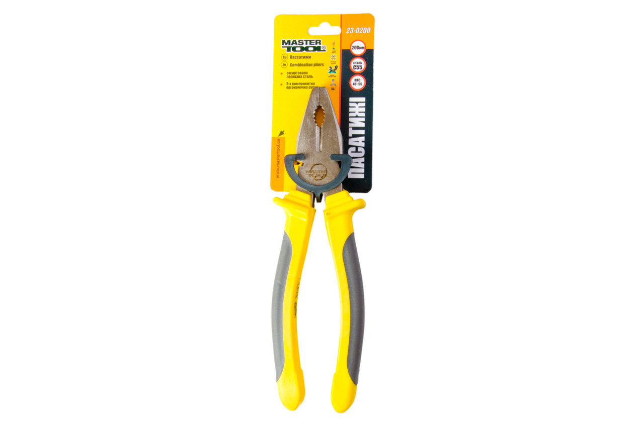 Виготовлені з вуглецевої сталі, частково оксидовані. Мають термооброблені, що володіють високими характеристиками міцності робочі поверхні і загартовані ріжучі кромки. Загальна довжина плоскогубців 200 мм. Колір ручок - жовтий + чорний.