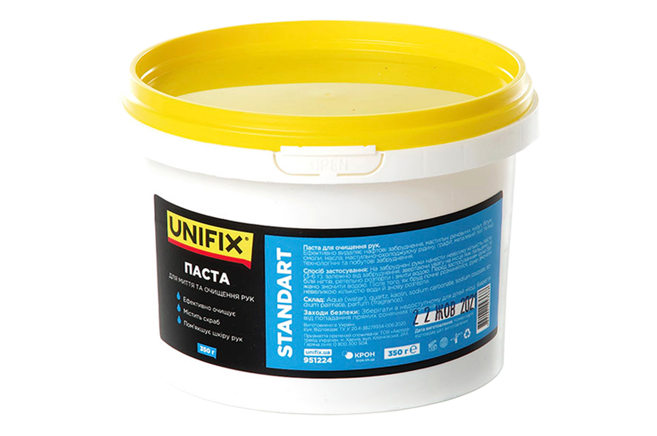Паста Standart від UNIFIX розроблена для очищення рук від слабких і середніх забруднень. Вона підходить як для побутового, так і для професійного використання. Ефективно видаляє нафтові забруднення, мастильні речовини, мазут, бітум, смоли та інші технологічні та побутові забруднення.