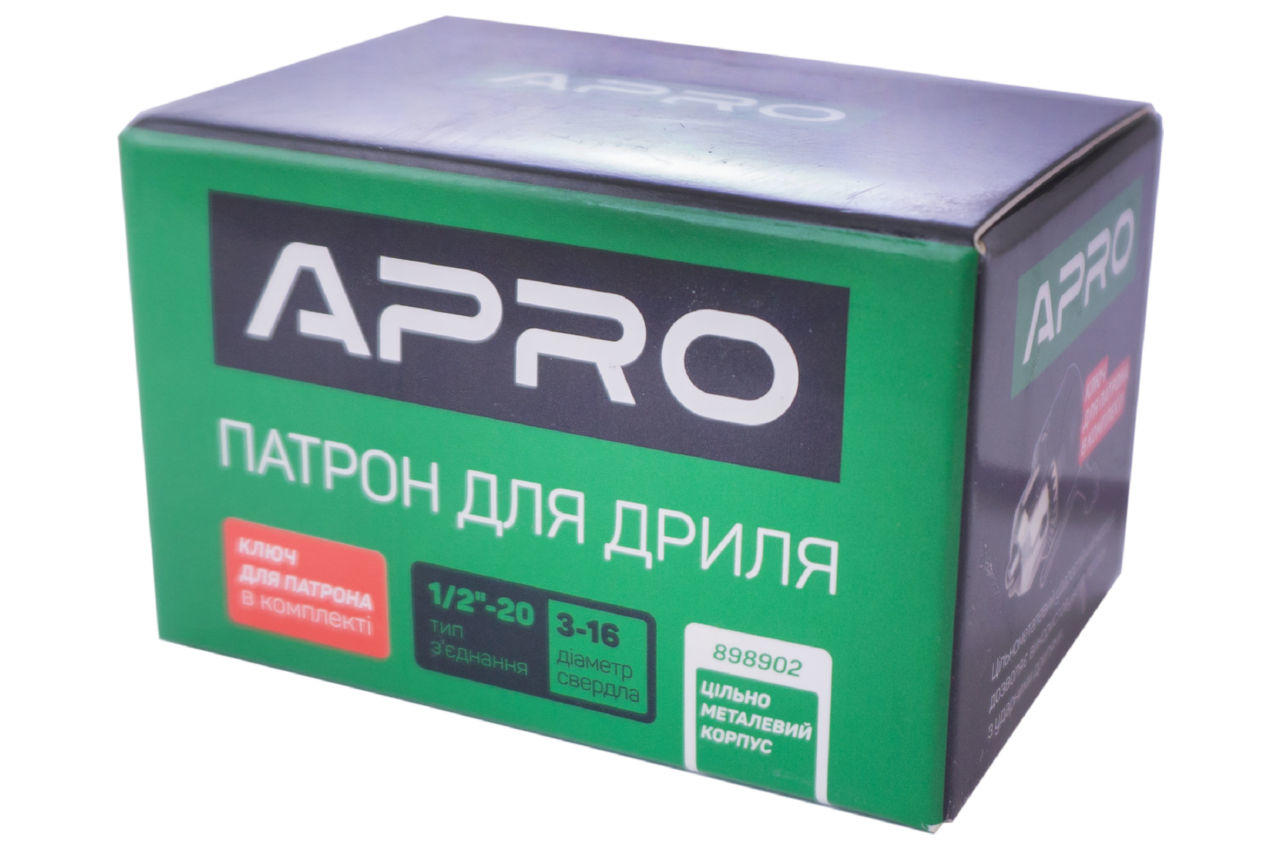 Патрон для дриля з ключем Apro - 1/2" x 20 x 3-16 мм Тип патрона З ключем Тип кріплення 1/2"-20 Діаметр свердла 3.0 – 16 мм