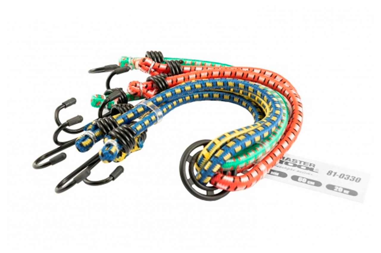 Резинки багажні Mastertool - призначені для фіксації вантажів під час транспортування. Використовуються в автомобілях, велосипедах, скутерах, мотоциклах, сумках-візках, тачках тощо. Довжина 600 мм. Діаметр 8 мм. Кількість гаків 8 од.
