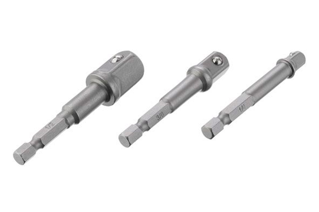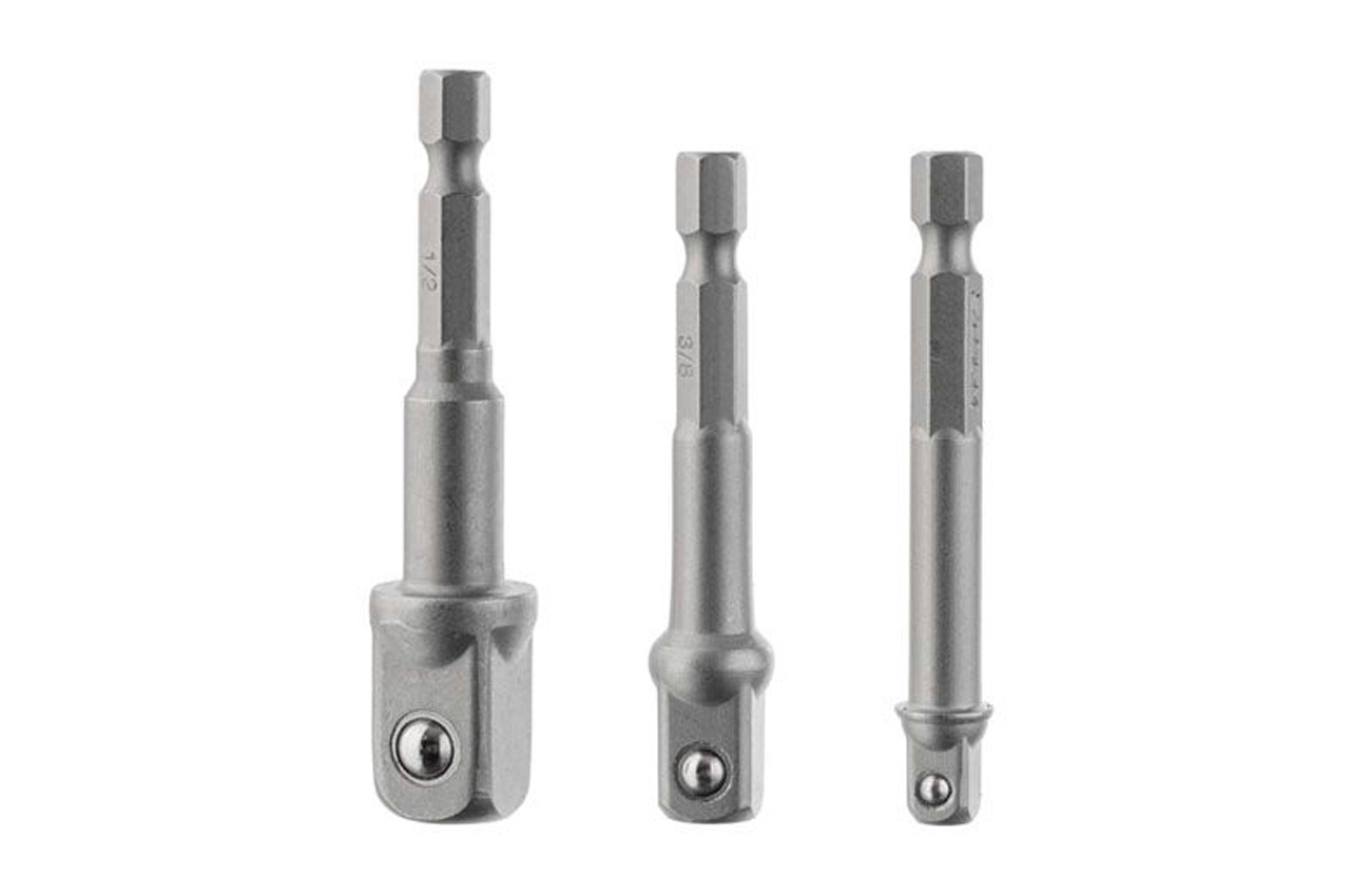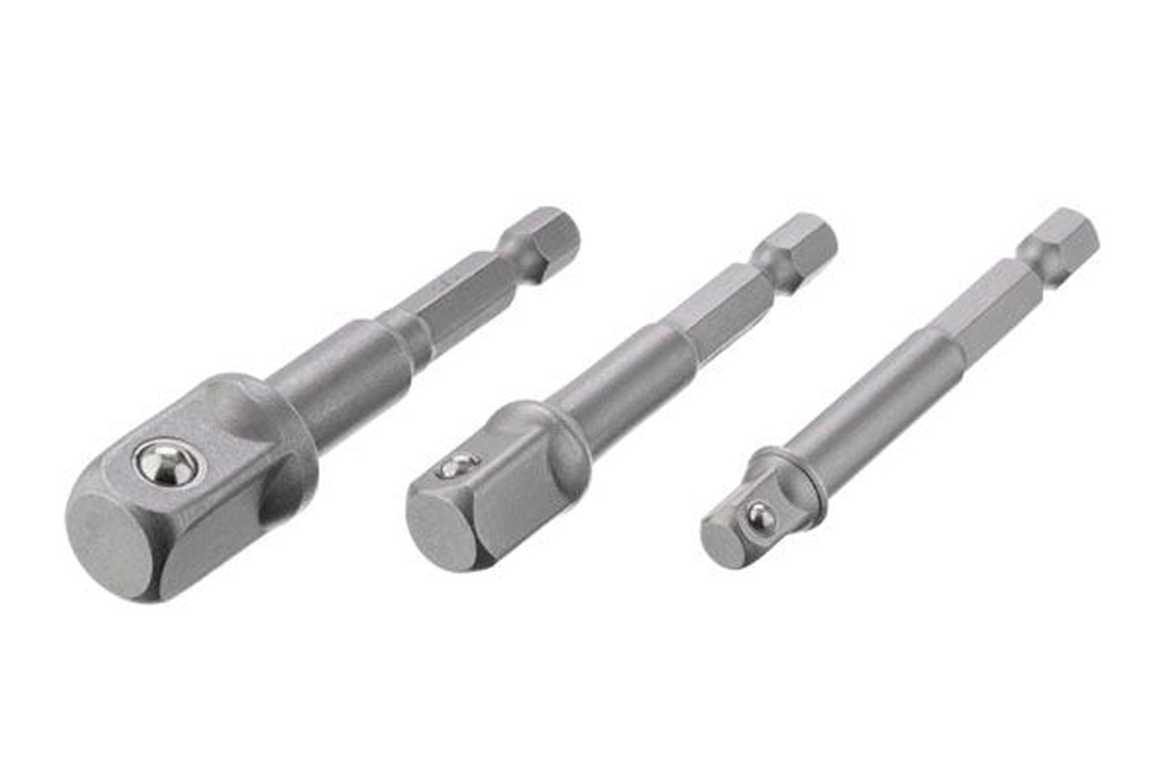 Набір з трьох перехідників-адаптерів використовується як у ручному інструменті, так і з дрелями, шуруповертами, гвинтовертами, завдяки універсальному шестигранному хвостовику 1/4". Тим самим розширюючи можливості інструменту, і дозволяючи працювати з оснасткою різного типу та розміру. торцевими головками, комірами та іншими подібними насадками, з розмірами посадкового квадрата 1/4", 3/8" та 1/2". Завдяки кульковому фіксатору насадки надійно кріпляться до перехідників.