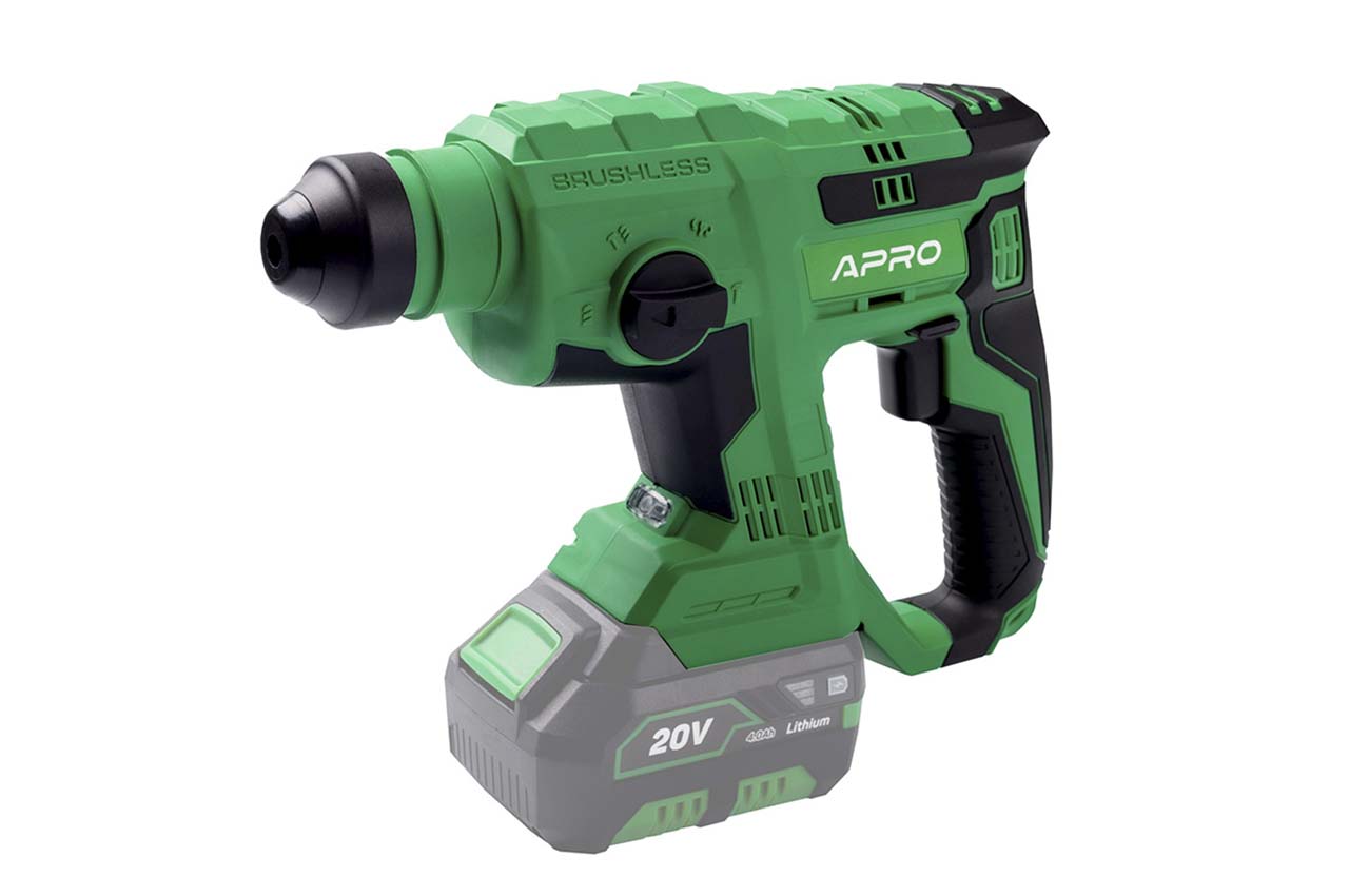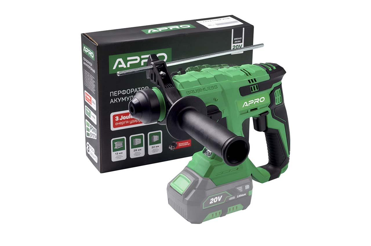 Перфоратор Apro 20CBH (без АКБ) має безщітковий двигун з міцним, надійним ударним механізмом, що видає потужну силу удару 3 Дж, кількість ударів до 4800 уд/хв. Цей аспект забезпечує масштабність, різноманітність спектру роботи, а саме: свердління цементу, бетону, шлакоблоку, сталі, демонтаж старої плити, вибивання штроб і т.д. Є плавне регулювання обертів. Заявлений тип двигуна витривалий, продуктивний, стійкий до перевантажень, не перегрівається. Ці характеристики забезпечують більш тривалий час успішної та плідної роботи майстра. Відсутність колектора знижує знос та механічні втрати. Досить компактний розмір, невелика вага 2,5 кг, ергометричний корпус із зручною прогумованою рукояткою дозволяють зберегти максимальний контроль над інструментом, забезпечуючи безпеку майстра. Сам корпус має високу стійкість до ударів і падінь.