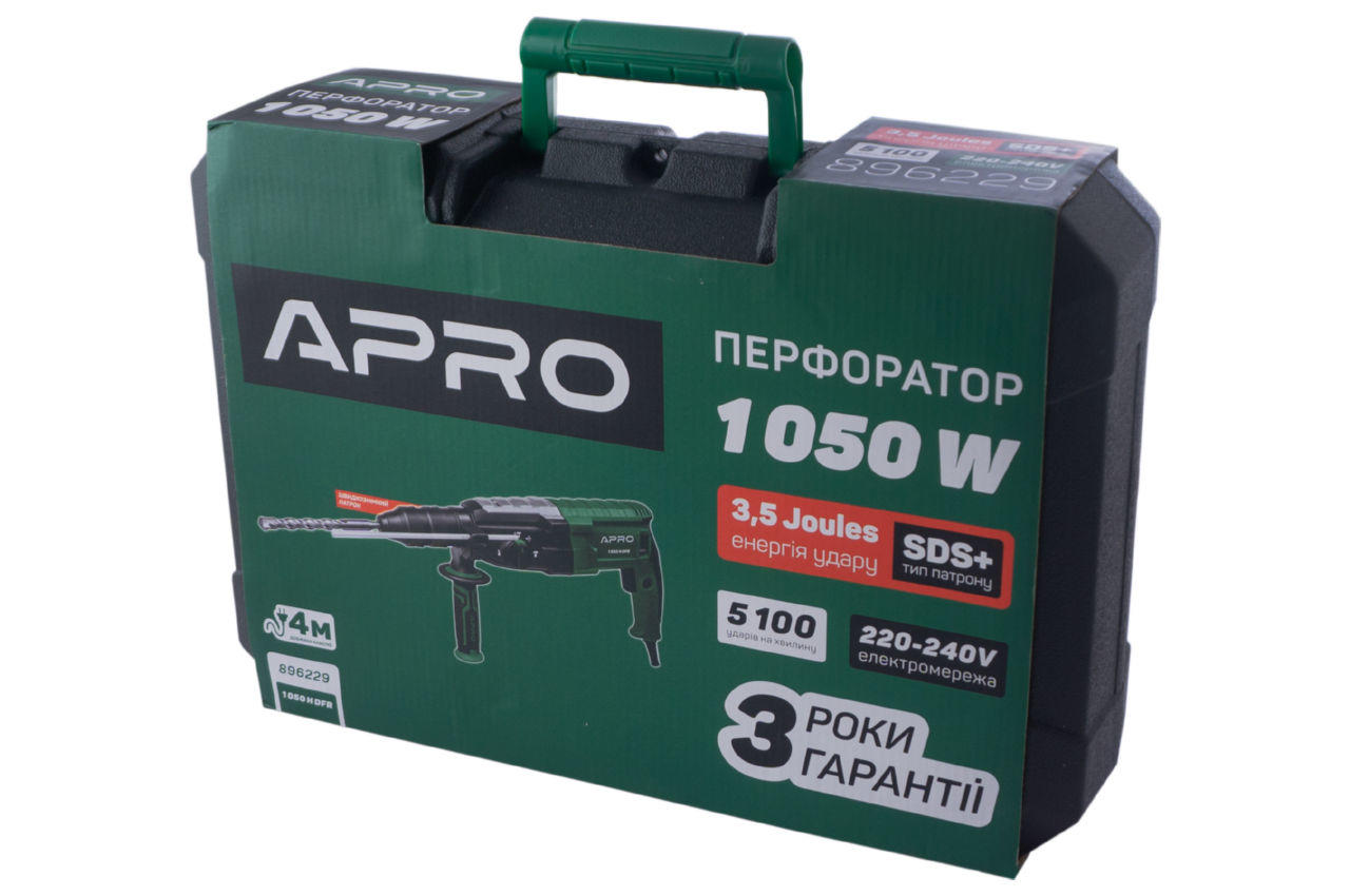 ПЕРФОРАТОР 1050 H має силу удару в 3,5 Джоулі та тип патрона SDS+. Працюючи від електромережі в 220 - 240 V, інструмент робить 1300 обертів на хвилину. Максимальна потужність інструменту становить 1050 Вт.