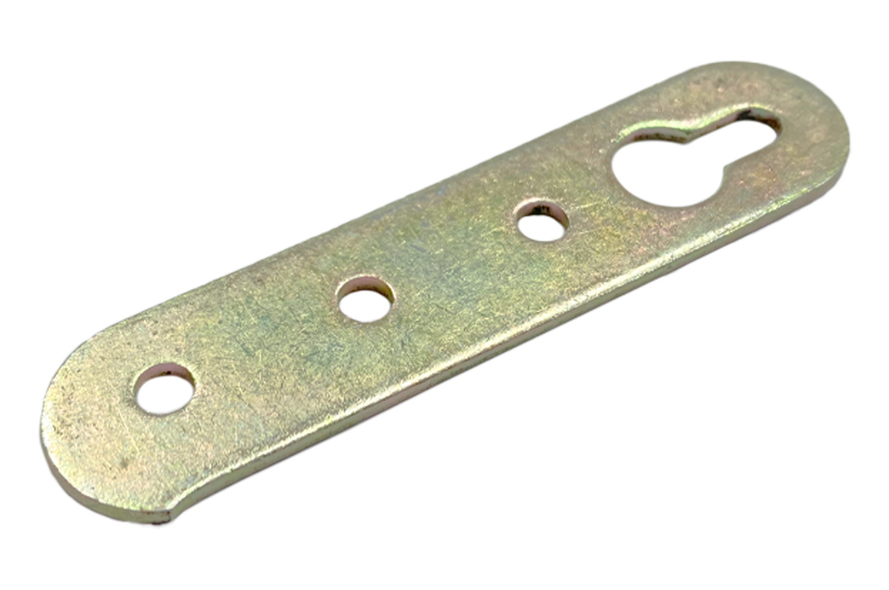 Підвіс дверний KS-UKR - це компактна металева пластина, призначена для кріплення замкових механізмів (личинок) у меблях, шафах, сейфах, скринях та інших конструкціях. Виготовлений із міцної сталі з цинковим покриттям, яке забезпечує захист від корозії та зносу. Отвори для кріплення дозволяють швидко і надійно зафіксувати елемент. Сумісний з більшістю стандартних типів замкових личинок.