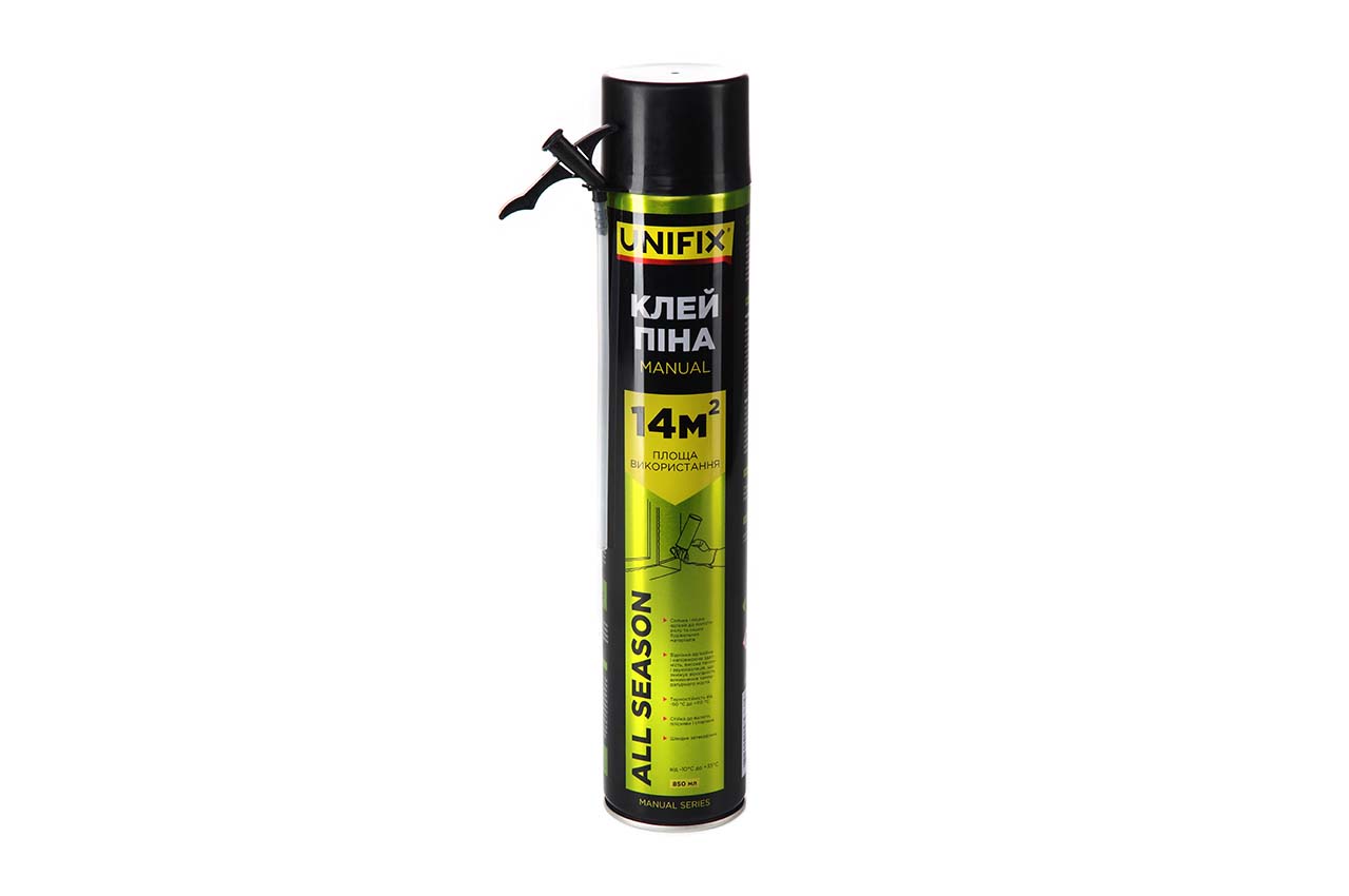 Піна-клей Unifix - 850мл x 14м² ручна приклеює пористий полістирол до більшості будівельних матеріалів (за винятком тефлону, поліетилену, поліпропілену), заповнює щілини між дошкою. Заповнення й герметизація швів, поріжень і проміжків у стінах. Кріплення й ущільнення навколо дверних і віконних рам, відкосів. Монтаж підвіконь і щаблів. Температура застосування від -10 до +35.