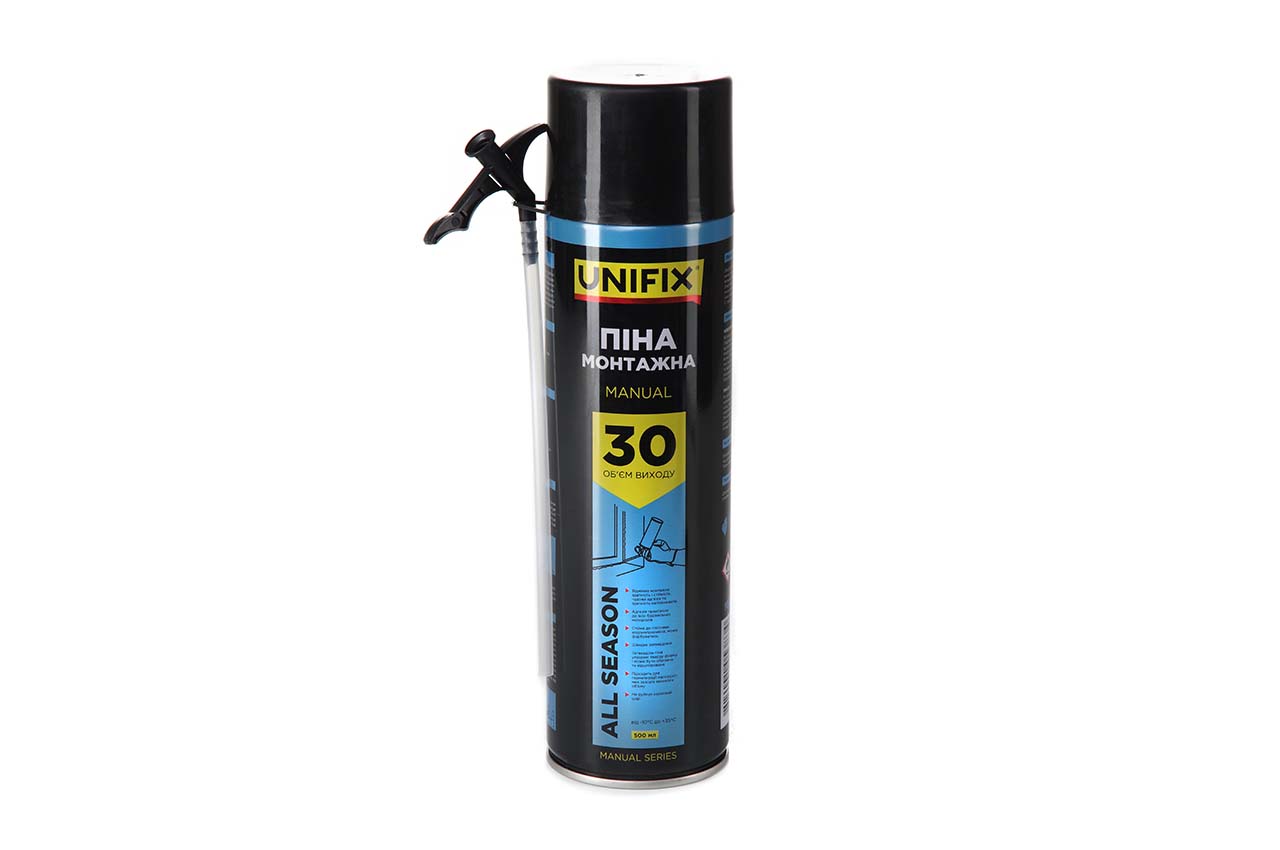 Піна монтажна Unifix - 500мл x 30л ручна. Має однорідну пористу структуру та чудову адгезію практично до всіх будівельних матеріалів, за винятком таких поверхонь, як поліетилен, тефлон, силікон, а також поверхні, що забруднені маслами та іншими речовинами. Температура експлуатації: від -10 до +35 °С. Сезонність: всесезонна. Вихід: 30 л
