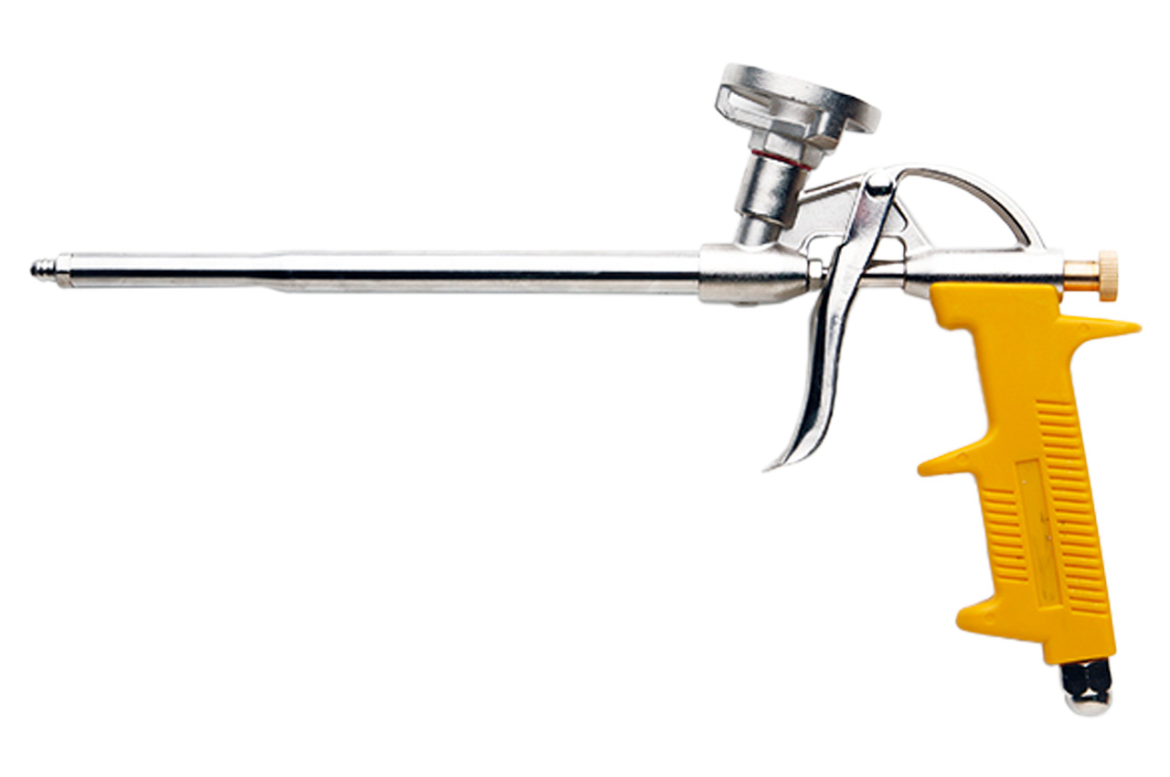 Призначений для проведення робіт з професійною монтажною піною при установці вікон, дверей, різних будівельних конструкцій. Подача піни регулюється розташованим над рукояткою пістолета гвинтом (його обертання за годинниковою стрілкою зменшує хід штока, скорочуючи кількість подається піни, і навпаки). Матеріал корпусу - нікель. Діаметр трубки, мм: 10; Матеріал корпусу: алюміній; Матеріал корпусу: Алюміній; Матеріал наконечника: мідний з нікелевим покриттям; Матеріал сопло: нержавіюча сталь; Регулювання подачі піни: гвинт