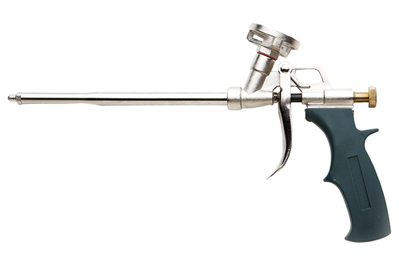 Призначений для проведення робіт з професійною монтажною піною при установці вікон, дверей, різних будівельних конструкцій. Подача піни регулюється розташованим над рукояткою пістолета гвинтом (його обертання за годинниковою стрілкою зменшує хід штока, скорочуючи кількість подається піни, і навпаки). Матеріал корпусу - нікель. Діаметр трубки, мм: 10; Матеріал корпусу: алюміній; Матеріал корпусу: Алюміній; Матеріал наконечника: мідний з нікелевим покриттям; Матеріал сопло: нержавіюча сталь; Регулювання подачі піни: гвинт