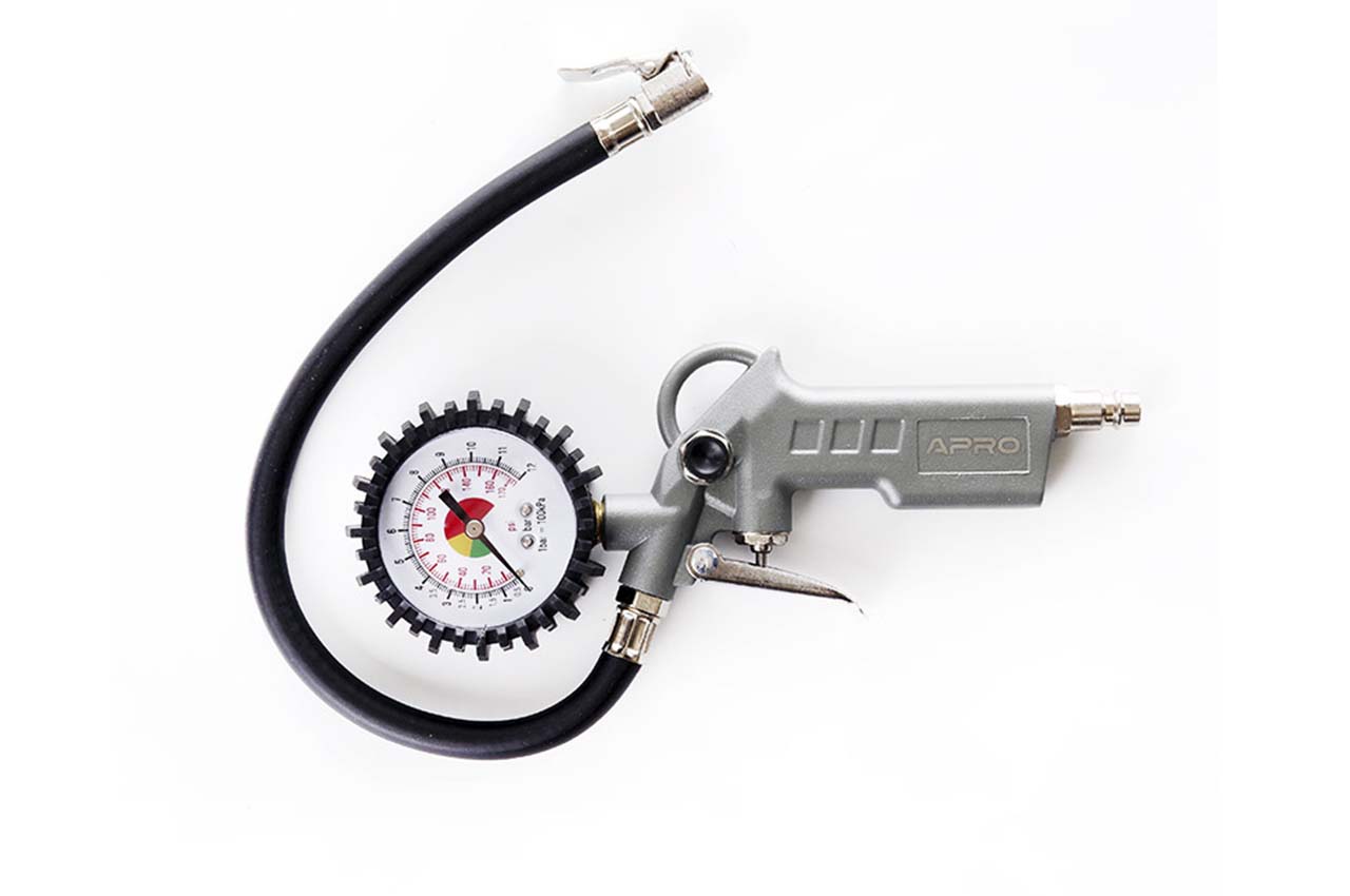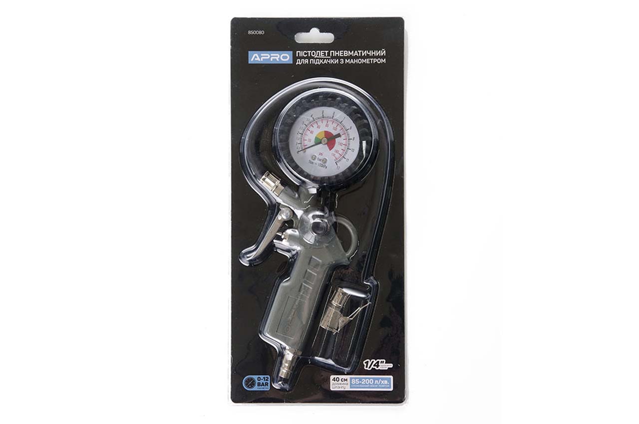 Пістолет пневматичний для підкачування коліс Apro - використовується для подачі і спуску повітря, а також для визначення тиску в шинах. Робочий тиск: до 12 атм