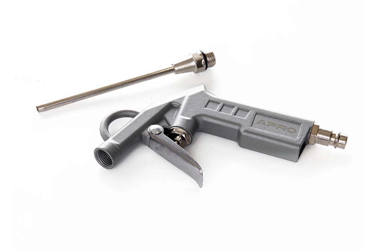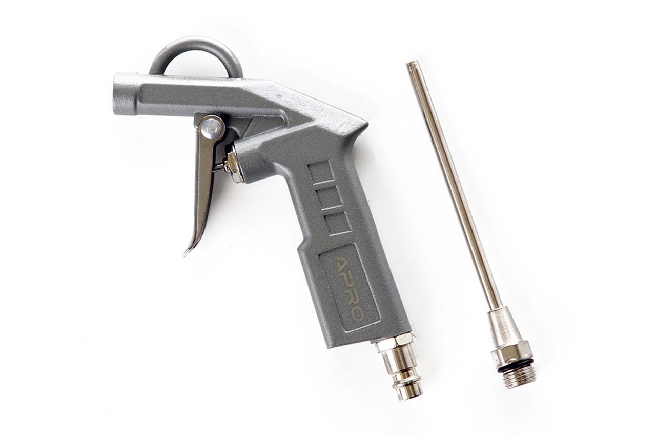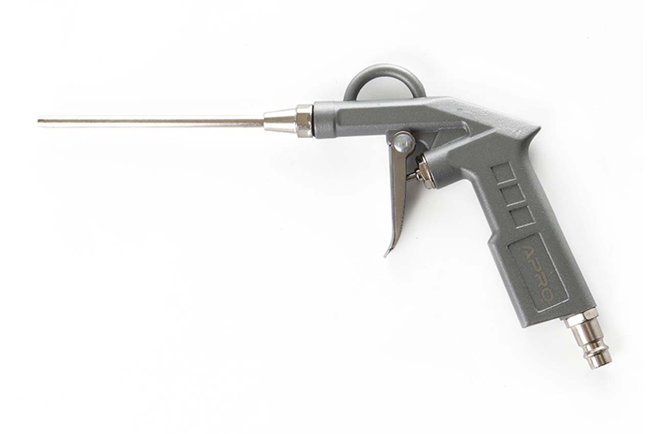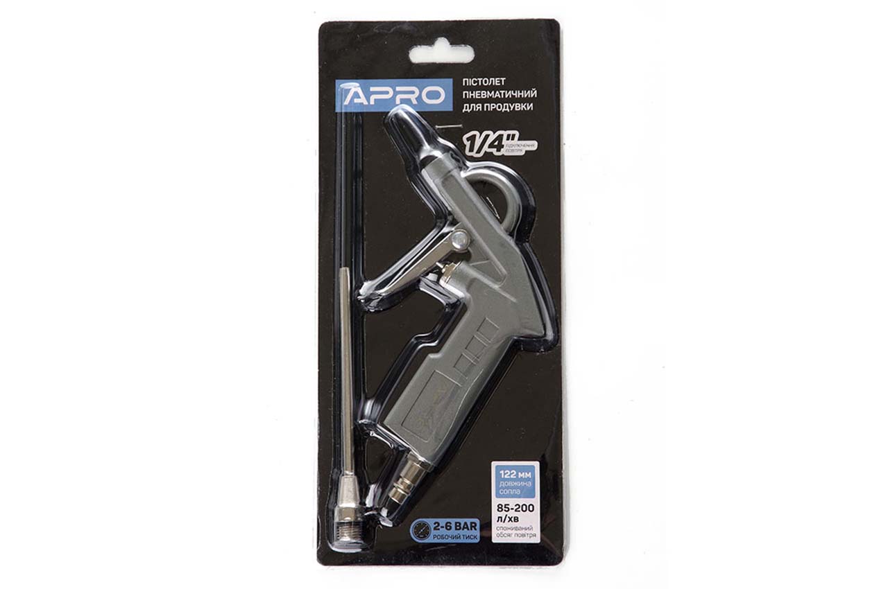 Пістолет пневматичний для продування Apro - використовується для очищення поверхонь від пилу. Область застосування: автосервіси, гаражі, станції технічного обслуговування автомобілів. Максимальний тиск 8 Бар; Довжина сопла 122 мм; Пневматичне з'єднання 1/4"; Споживаний об'єм повітря 85-200 л/хв; Робочий тиск 2-6 Бар