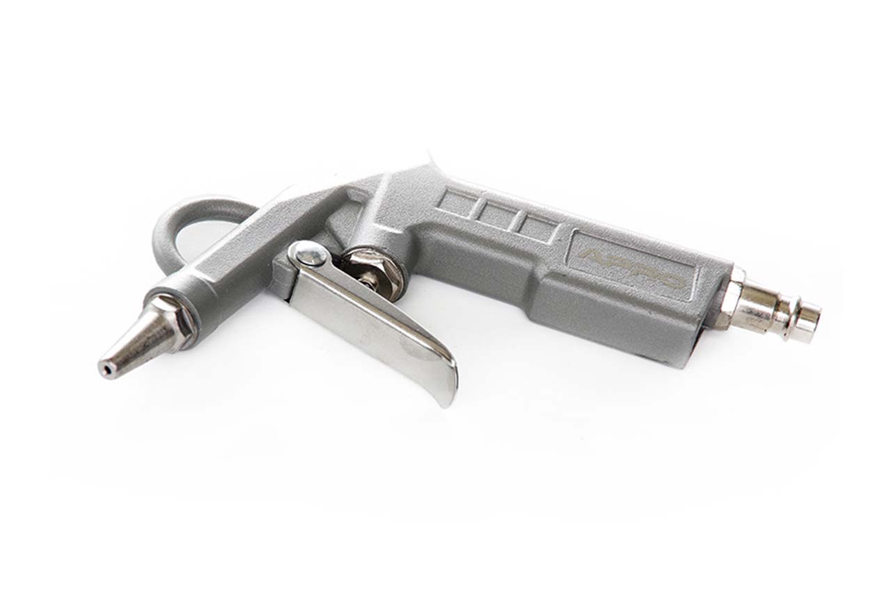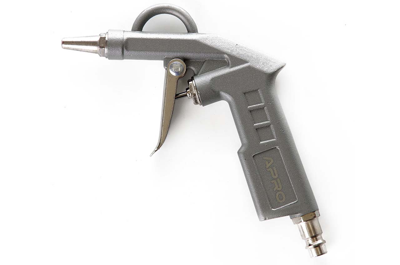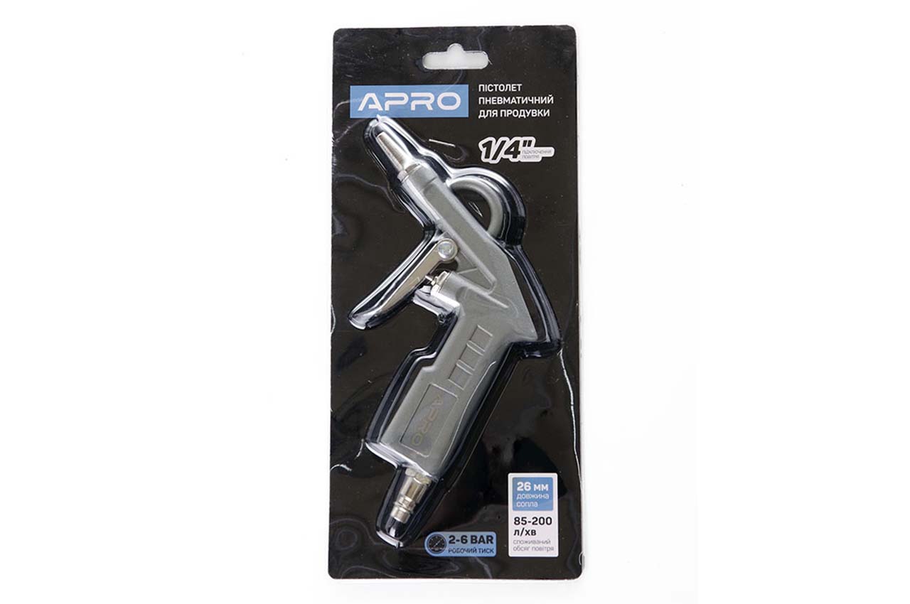 Пістолет пневматичний для продування Apro - використовується для очищення поверхонь від пилу. Область застосування: автосервіси, гаражі, станції технічного обслуговування автомобілів. Пневматичне з'єднання 1/4"; Робочий тиск 2-6 Бар; Витрата повітря 80-200 л/хв