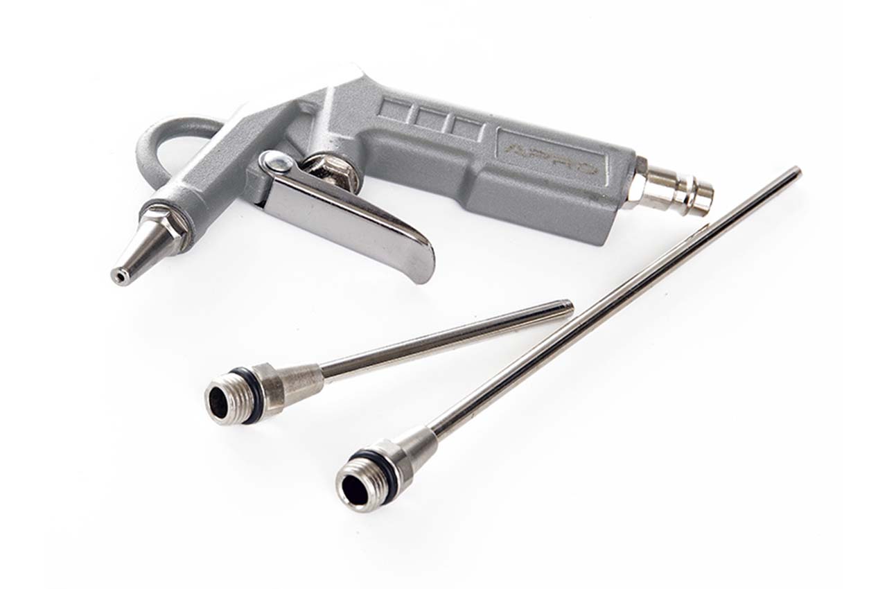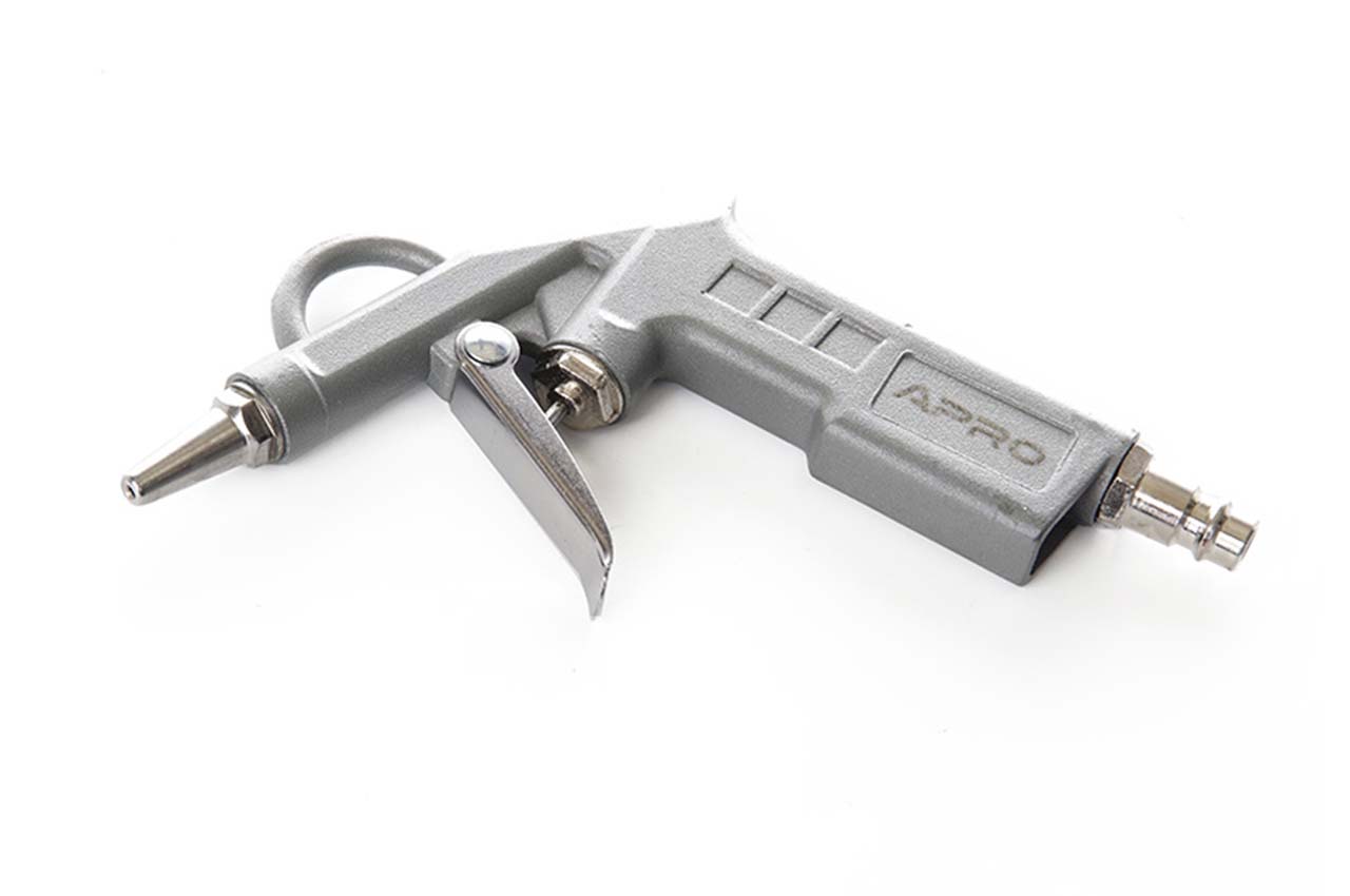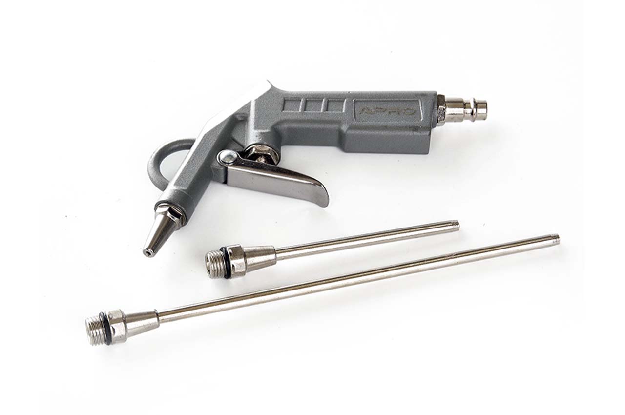 Пістолет пневматичний для продування Apro - використовується для очищення поверхонь від пилу. Область застосування: автосервіси, гаражі, станції технічного обслуговування автомобілів. Максимальний тиск 8 Бар Довжина сопла 26, 122, 212 мм Пневматичне з'єднання 1/4" Споживаний об'єм повітря 85-200 л/хв Робочий тиск 2-6 Бар