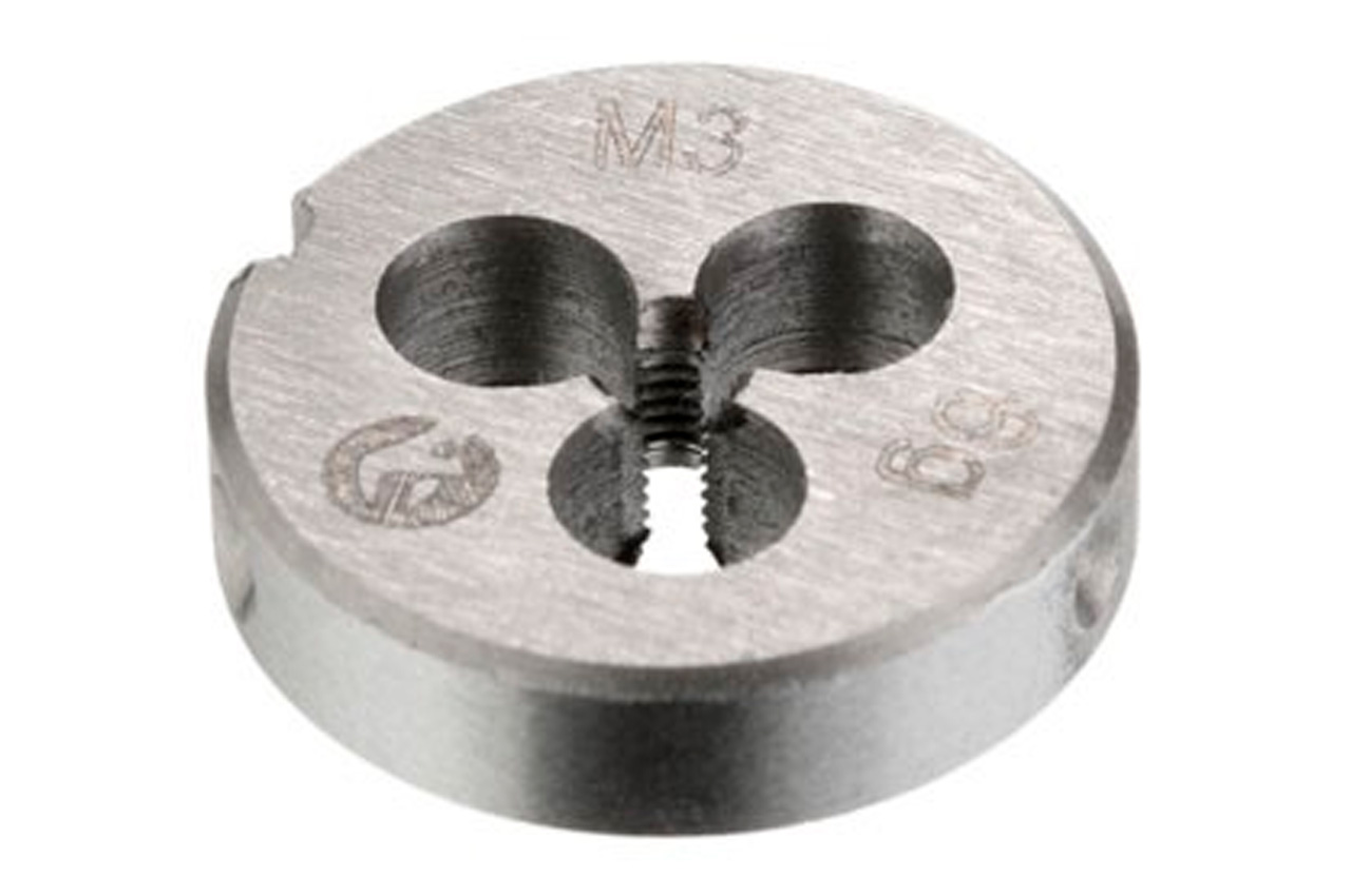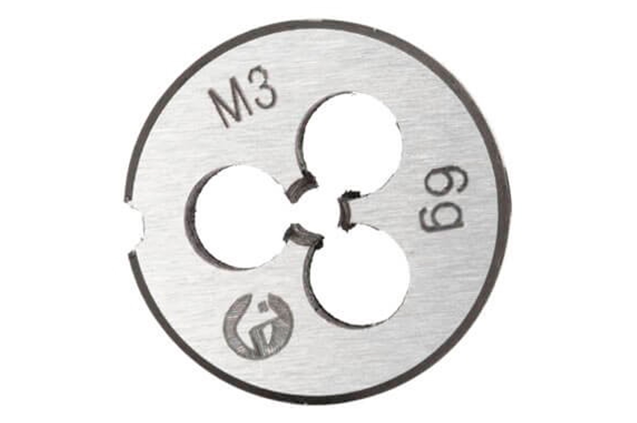 Плашка M3 x 0,5 мм різьбонарізний інструмент призначений для нарізування зовнішньої різьби вручну або на металорізальному верстаті. Розмір: М3x0,5 мм