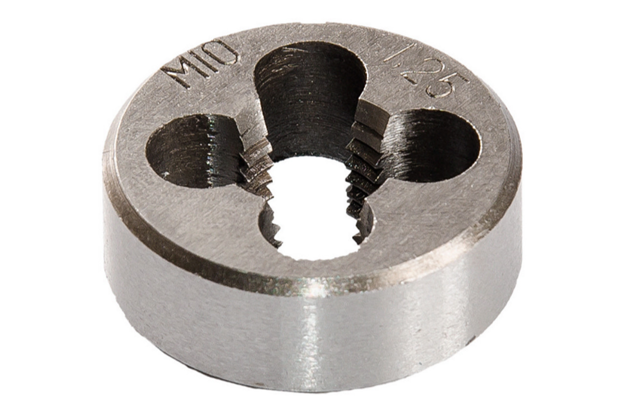Плашка сталь Р6М5. Призначається для нарізання зовнішнього різьблення на металевих виробах. Діаметр 10 мм Крок різьблення 1,25 мм Метрична різьба DIN 233