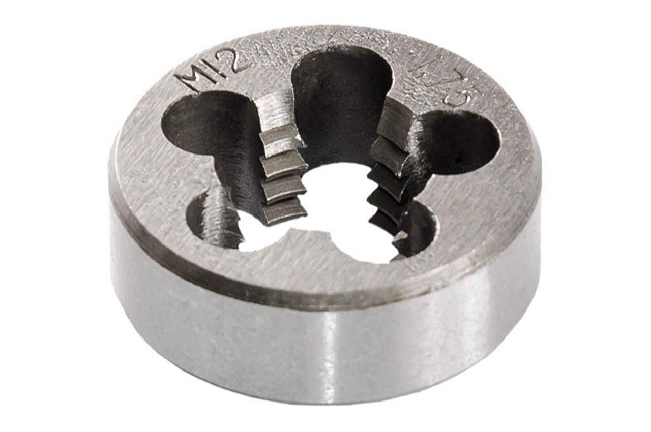 Плашка сталь Р6М5. Призначається для нарізання зовнішнього різьблення на металевих виробах. Діаметр 12 мм Крок різьблення 1,75 мм Метрична різьба DIN 233
