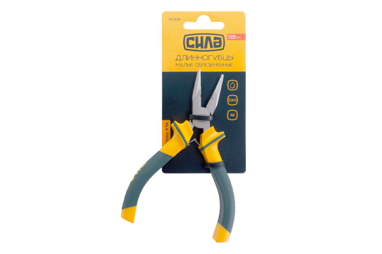 Длінногубци малі, прямі, обгумовані. Матеріал рукоятки: пластик, термопластичная гума. Матеріал: інструментальна сталь. Матеріал рукоятки: пластик, термопластичная гума; Тип: пряма
